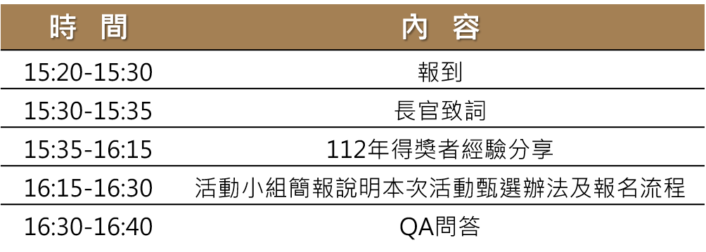 為了讓參賽者更加了解本次徵獎重點、徵件辦法以及如何撰寫報名資料,更特別邀請歷屆觀光從業人員得獎者,現場分享如何準備參賽資料,歡迎優秀的觀光人快來聆聽,讓觀光人靚起來,共同打造全球旅客最美好的台灣之旅。