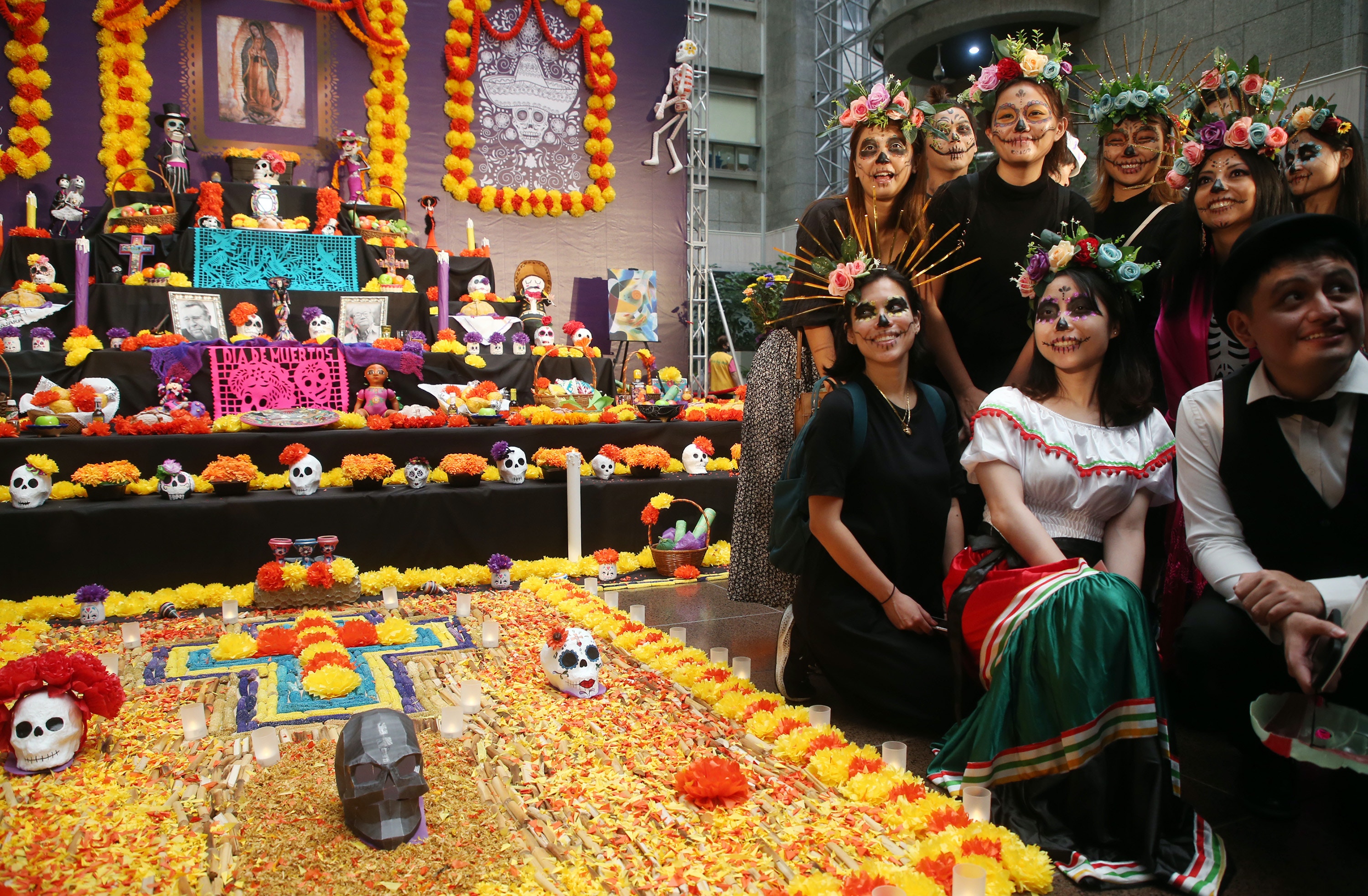 骷顱、柯巴樹脂、萬壽菊和代表各地傳統美食的麵包擺放在祭壇上,