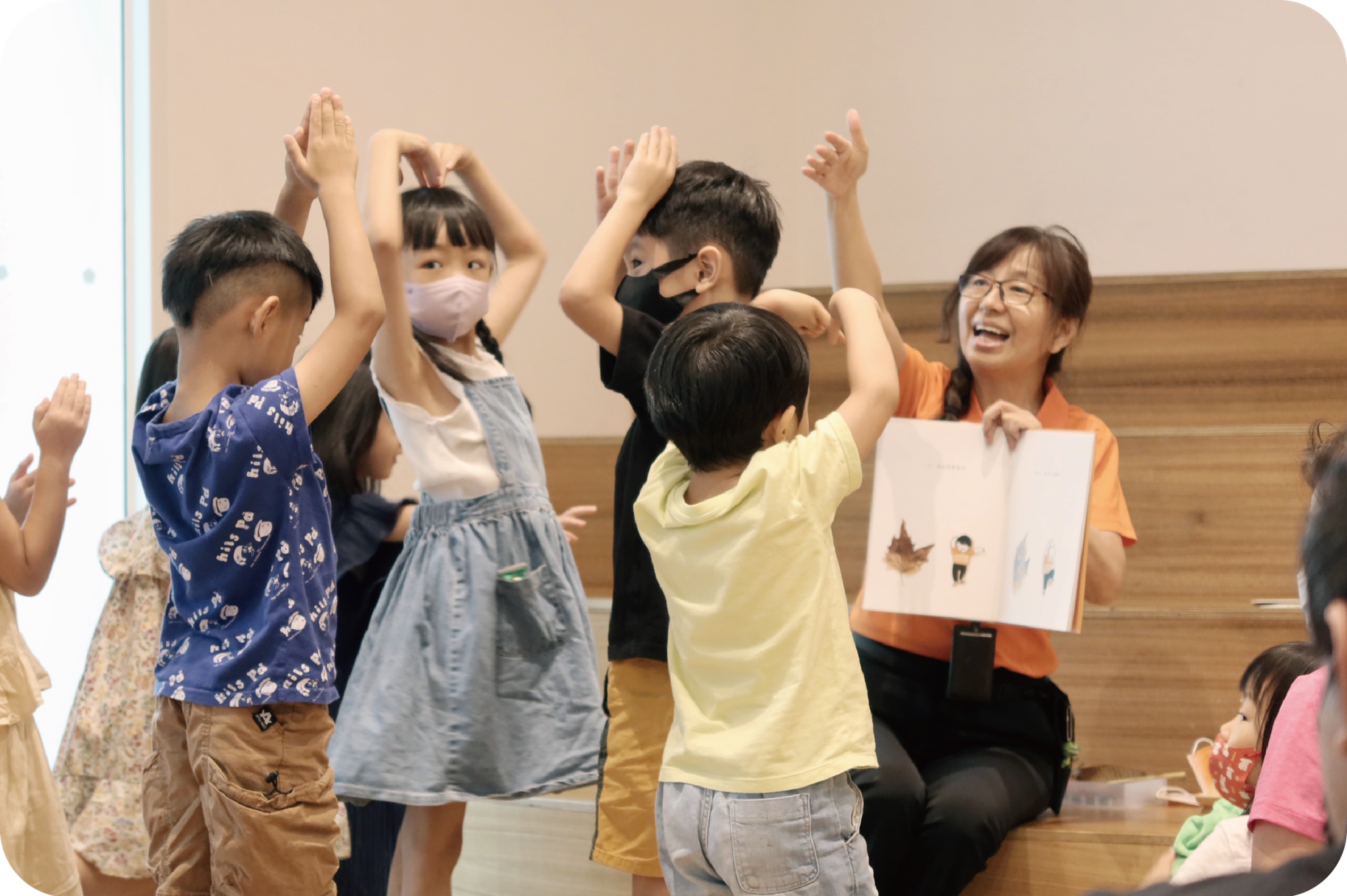 「聽聽故事 動動手」系列活動取自當期特展「愛洛蒙-人與動物的後心靈樂園」展覽概念,挑選與貓狗相關的陪伴、領養與生命議題繪本,讓志工們帶領小朋友一起走入貓貓狗狗的世界,本季活動更加入了臺語場與英語場,歡迎家長與小朋友們跟著我們一同用多元的語言欣賞繪本故事 !