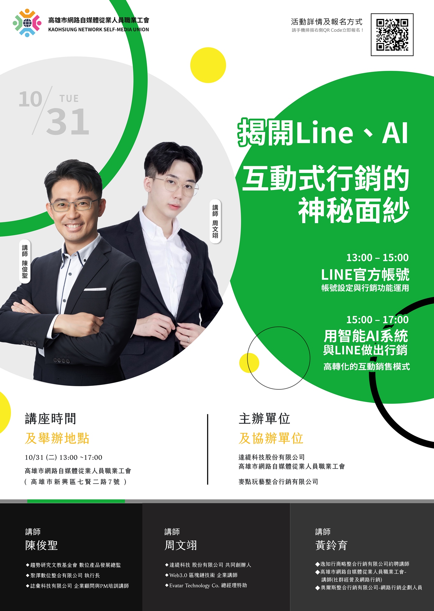 - 由三位資深講師主講,深入淺出地分享 LINE 官方帳號、AI 技術、互動式行銷的最新趨勢與應用實例。