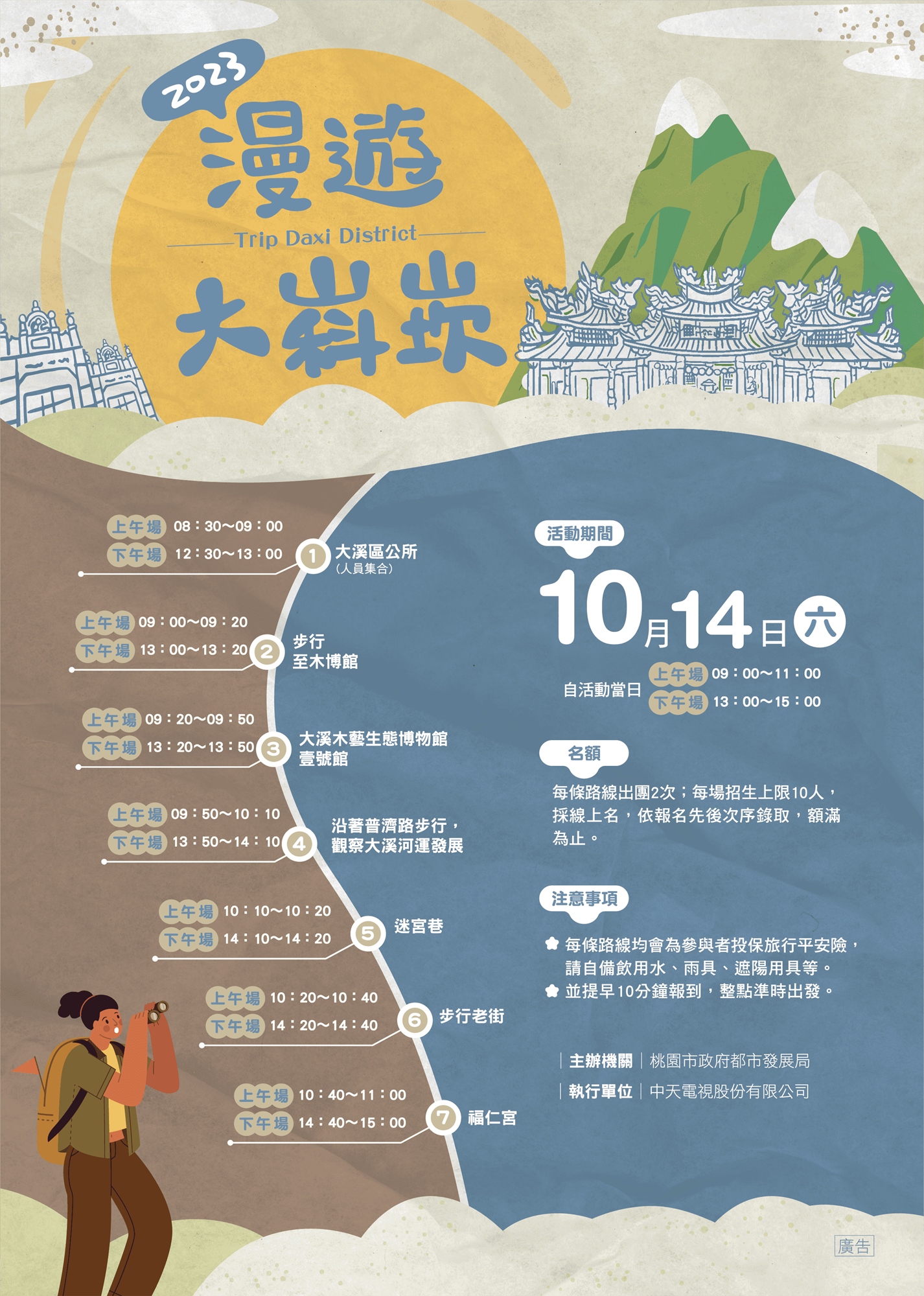 大溪曾經是北台灣重要的河運據點,因而匯集自然人文和生活產業的豐富小鎮。也是桃園最早發展的地方,透過大漢溪小帆船行駛淡水河,造就了許多商號與商賈。和平路、中山路等老街,充滿濃濃日治大正時代流行巴洛克建築風格,融合巴洛克式繁飾主義和閩南傳統裝飾圖案,是大溪的特色。而將透過走讀活動引領您看見大溪底蘊之美。