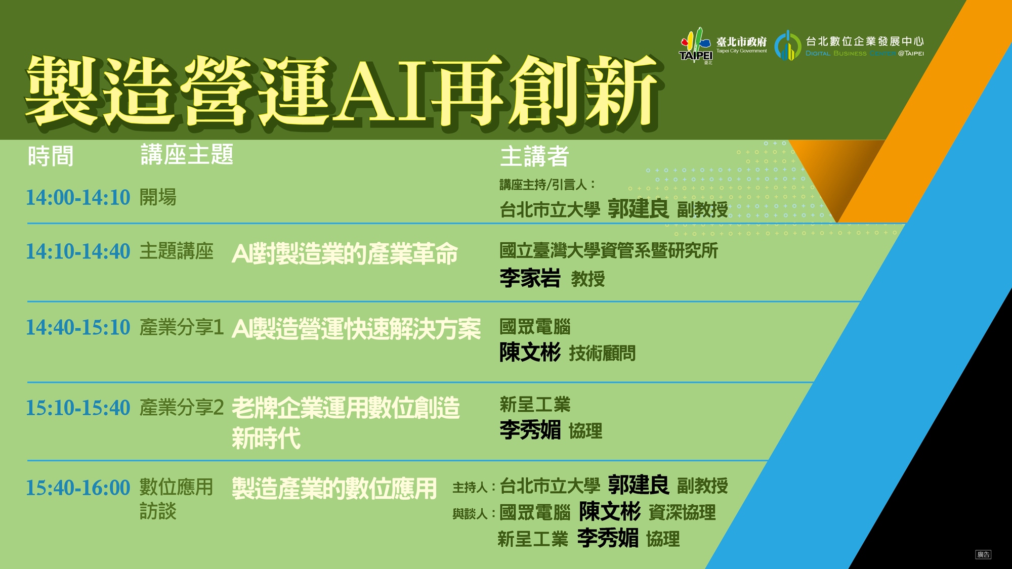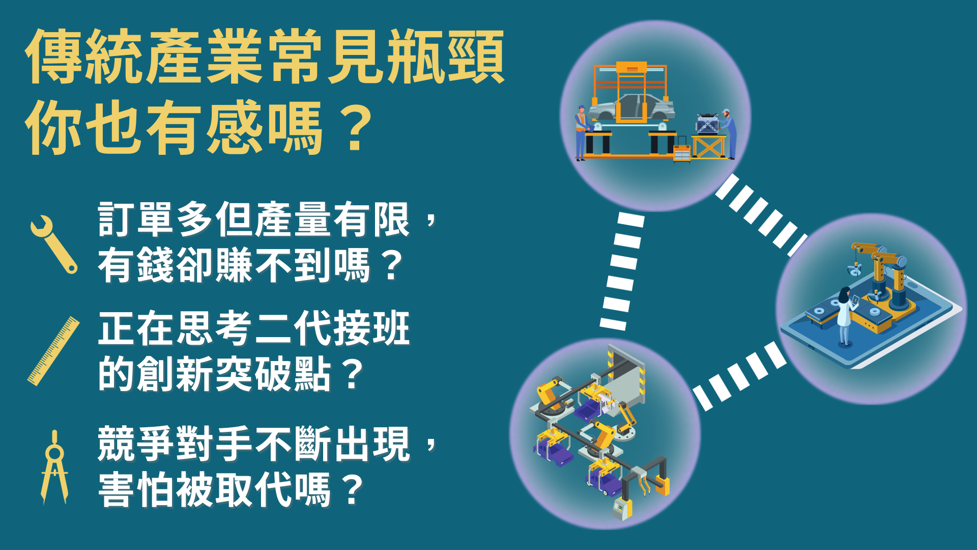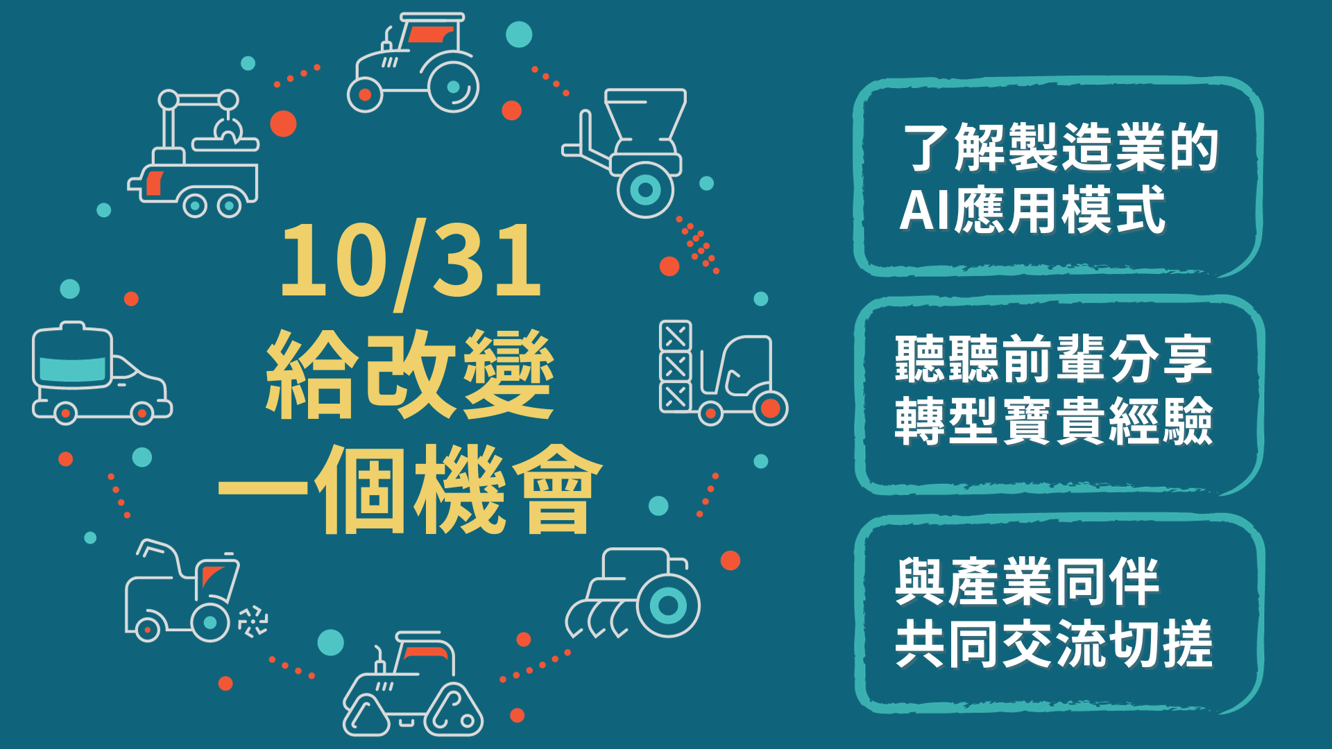 轉個念頭把握更多商機,專家來教你! 適合對象想用更高效率管理生產作業的你想辦法創造公司更高產值的你身為二待準備接班的你有轉型想法,但還沒找到方案的你 你將獲得了解製造業的AI應用模式聽到前輩分享轉型的寶貴經驗與製造產業夥伴的交流機會