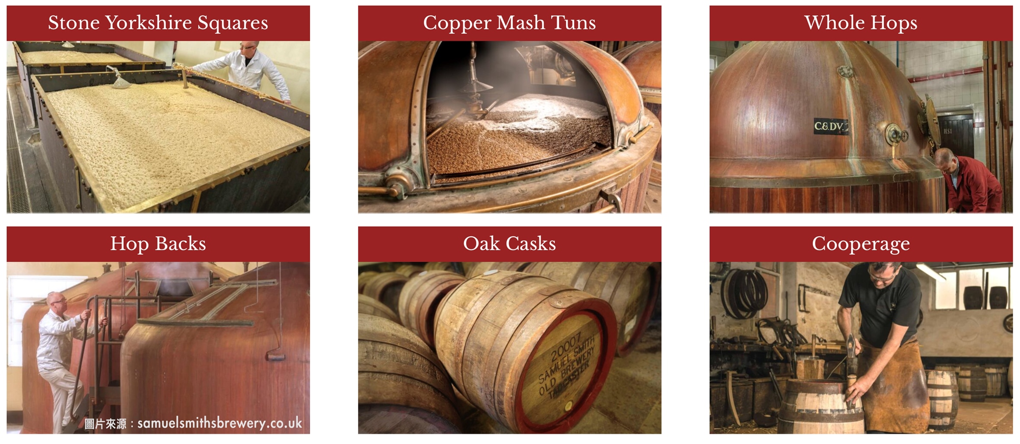 Samuel Smith’s酒廠265年來堅守傳統,除了發酵槽的特殊材質與功用外,今天釀酒的水依然使用1758年開鑿的井水,馬車也依然是酒廠內運送啤酒的工具,酒款依然以呈現經典英式風味為主。最值得慶祝的是,除了Cask Ale之外,我們在台灣可以品嘗到幾乎所有Samuel Smith’s帶來的傳統英式風味。