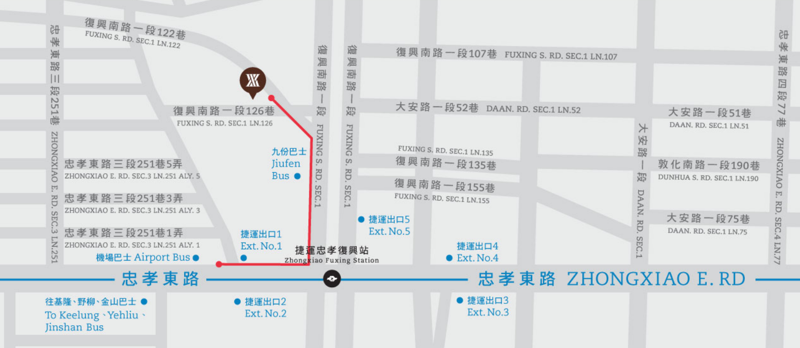 捷運:搭乘板南線,至忠孝復興站,1號出口步行5分鐘