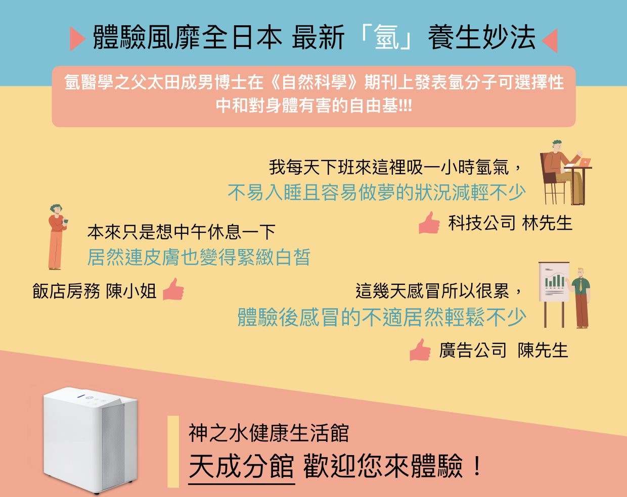 活動透過1.呼吸氫氣2.飲用氫水調理身體。或者3.氫噴霧調理肌膚。