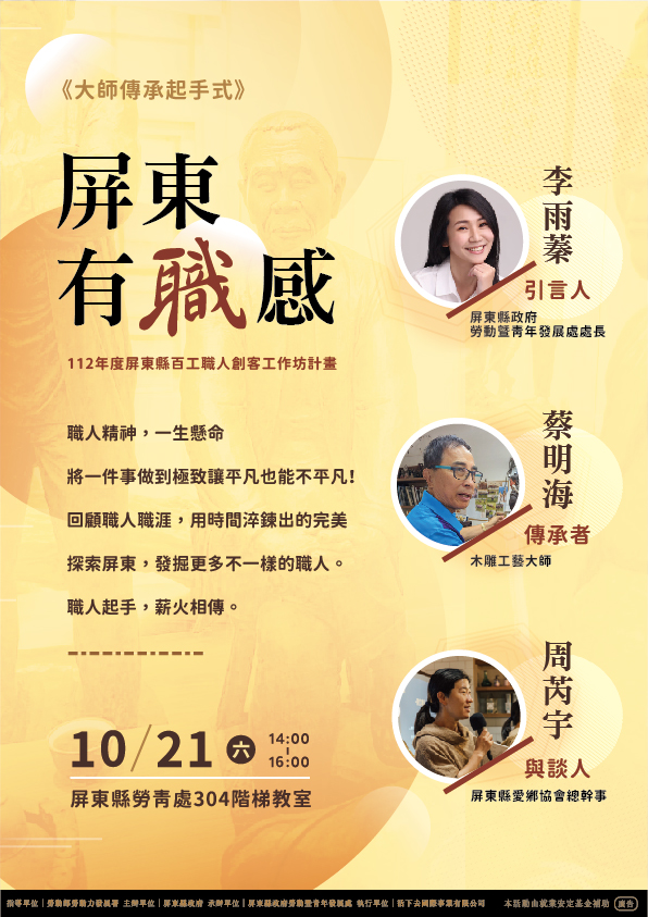 屏東縣愛鄉協會,長期盤點屏東在地,對於屏東的文史與職人探訪,都留下了許多繼續,特別邀請愛鄉協會周芮宇總幹事分享屏東職人特色觀察;最後邀請兩位老師給未來職人們一些執業生涯的提醒。
