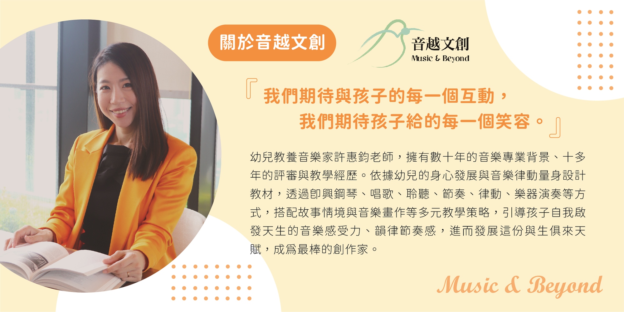 跨領域發展,寫作、藝文推廣、兒童教育、公益活動、戲劇節目、文化創意發展,近年深耕幼兒音樂素養、創作力的培養,積極參與相關活動,目前專研以音樂培育幼兒教養、情緒管理、美感素養、性格發展等議題,並深入投入我國音樂教學發展相關議題,希望能引領父母們在家也能創造與孩子的音樂親密時光。