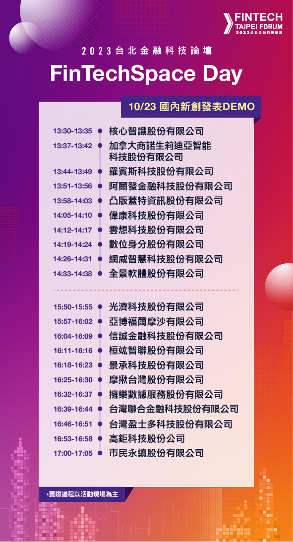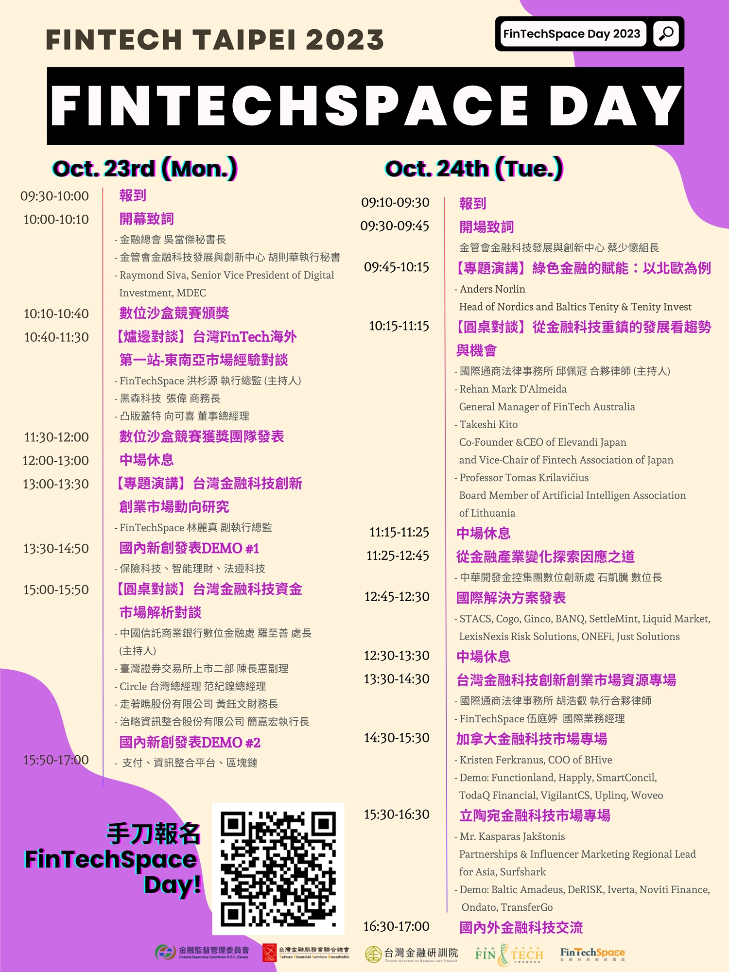 【Day 2】2023 年 10 月 24 日 (星期二) 09:30至 17:00。 - 活動地點:FinTechSpace (台北市中正區南海路1號13樓)