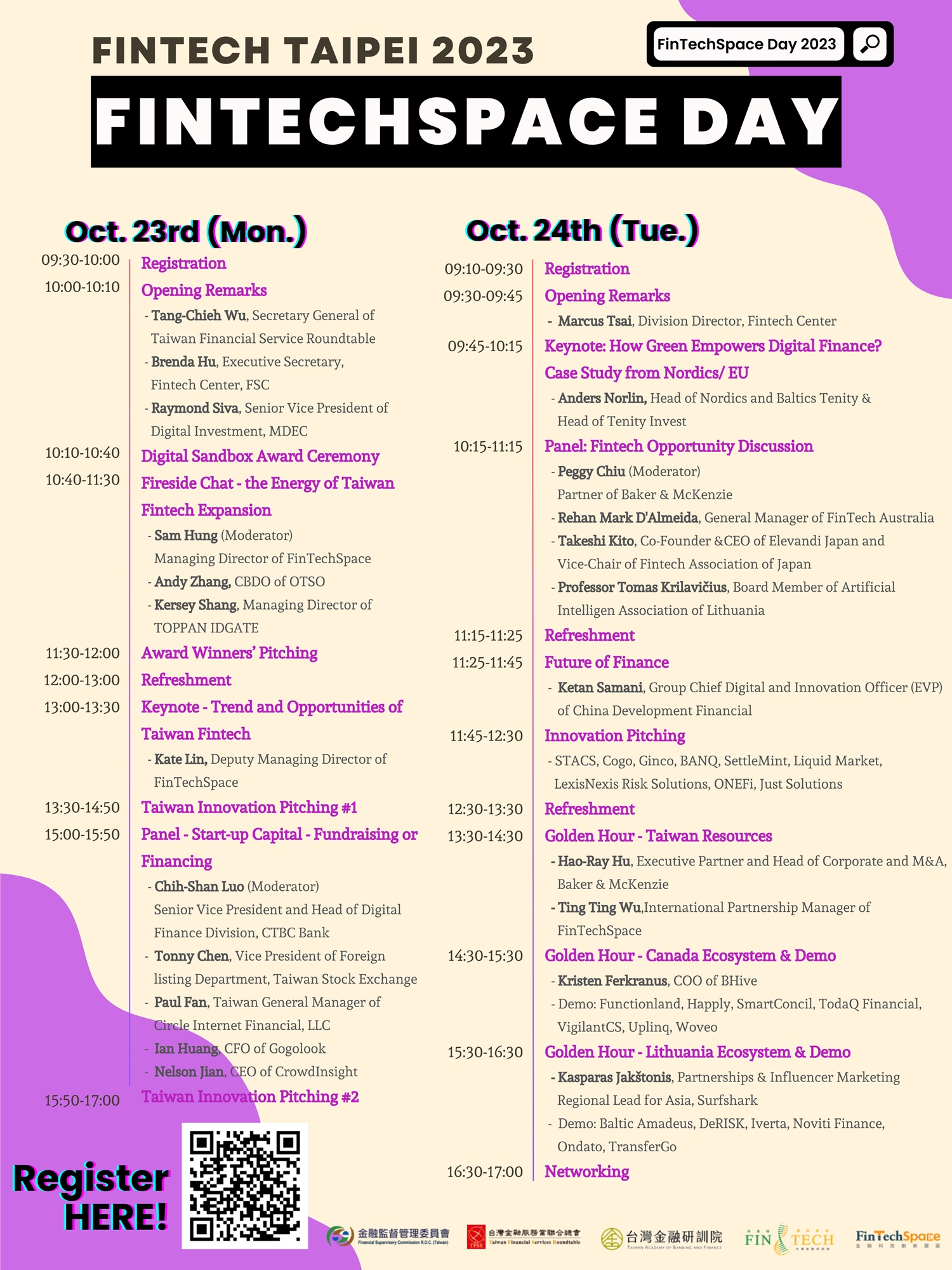 The first two days of the event (October 23rd (Monday) and 24th (Tuesday)) will be dedicated to "FinTechSpace Day", and will focus on resources and needs for fintech startup development, as well as trends in AI and green fintech. It will feature golden hours of Taiwan, Canada and Lithuania, keynote speeches, roundtable forums, fireside chats, elevator pitches, and more. We welcome those interested in gaining a deeper understanding of domestic and international FinTech innovation and entrepreneurship to register and participate!