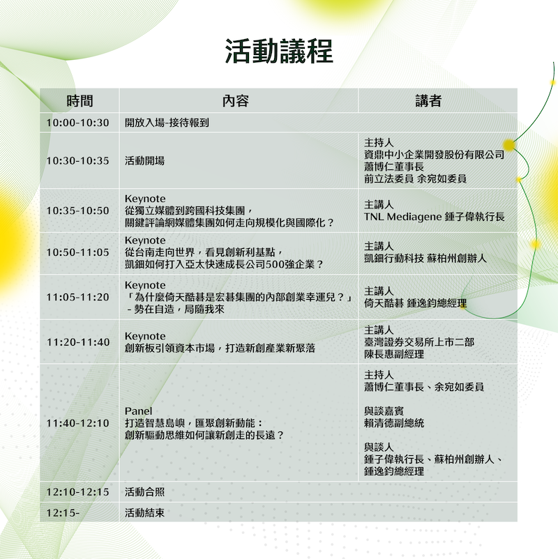 本次活動將會有三位已獲得初步成果的台灣新創企業家,分享如何制定商業計劃、找到資源、成功轉型,同時由證券交易所第一手解析創新板大小事,更特邀賴清德副總統參與論壇交流,期望攜手企業、市場與政府共同完善台灣的新創生態系。