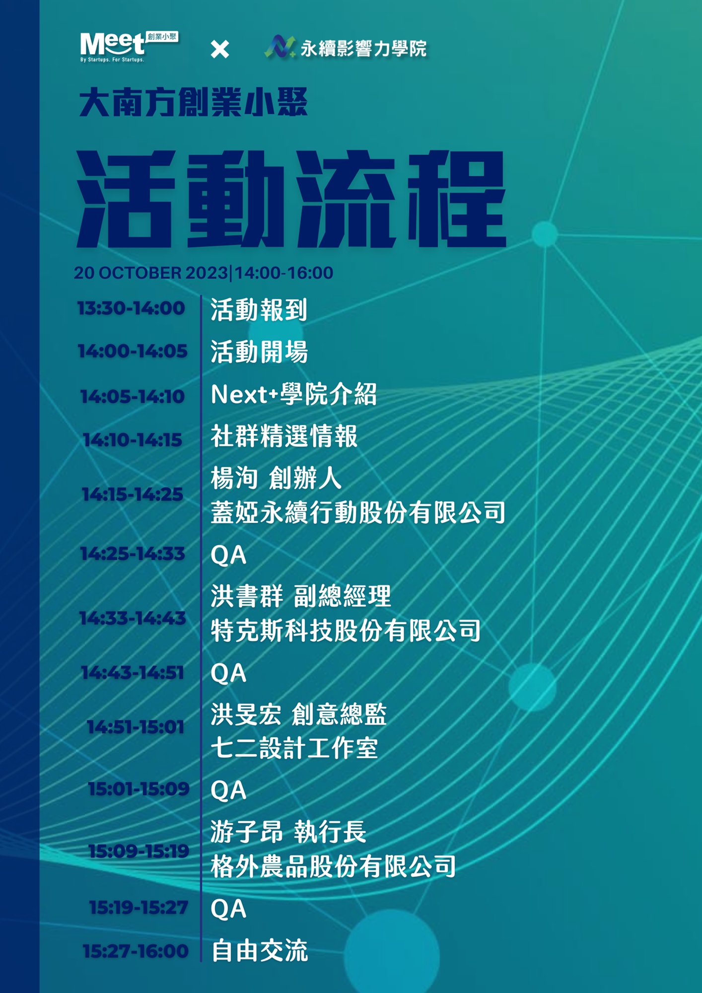 為了推廣NEXT+永續影響力學院的新創能量,與創業小聚合辦「大南方創業小聚」,讓更多人了解學員在永續議題上的發展狀況並推廣,特別邀請了四組優秀的創業團隊參與,他們將分享創新創業的經驗,並尋求合作機會,進一步連結在永續創新的主題。