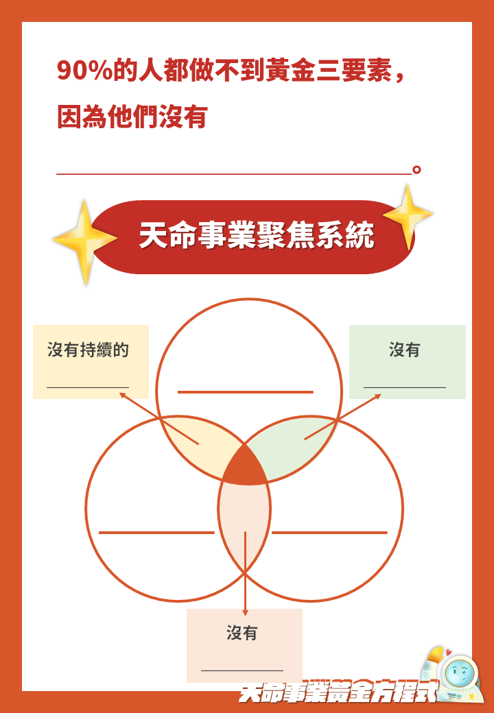 在這次的「天命事業黃金方程式」中,我們會教你如何打造一個事業體,讓你能夠擁有「持續的客戶」、「持續的收入」及「持續的熱情」去成就你的美好生活與願景。