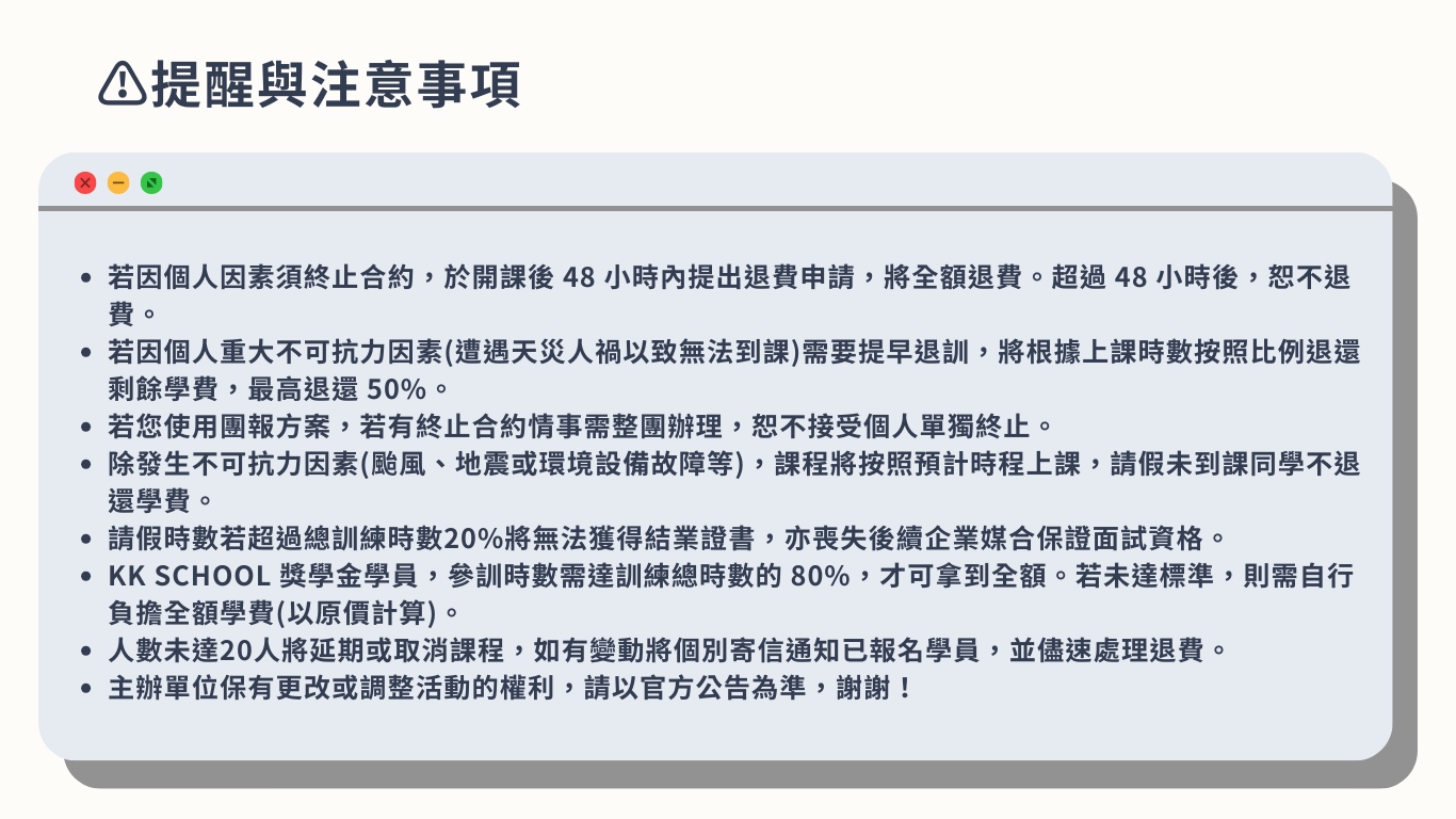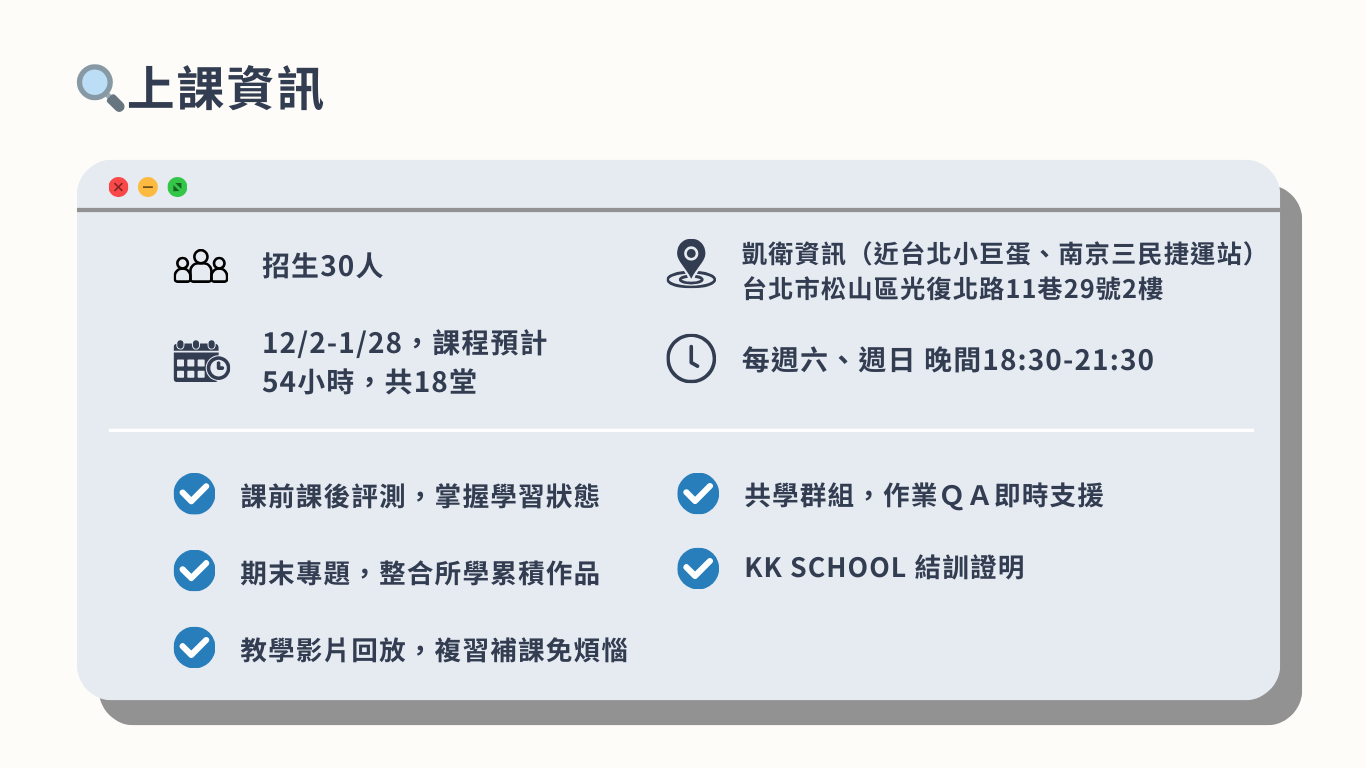 KK SCHOOL是凱衛資訊(股票代號:5201)旗下的專業教育品牌。我們專注於程式培訓,幫助社會新鮮人和轉職者以及任何渴望學習的你,快速掌握職場需求技能。