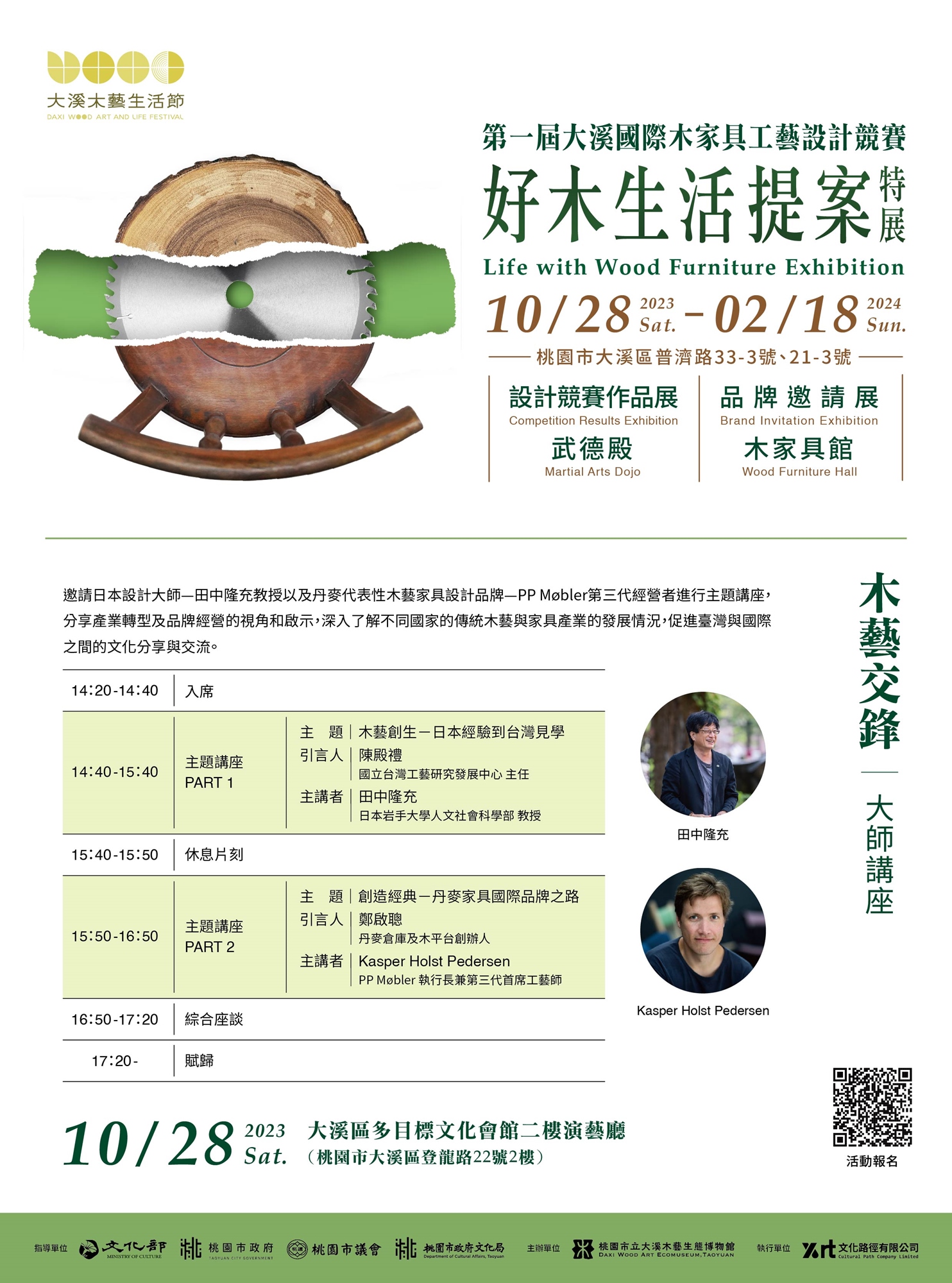 大溪木藝生態博物館舉辦「第一屆大溪國際木家具工藝設計競賽」,為導入國際性視野,特別邀請 日本設計大師—田中隆充教授 以及 丹麥代表性木藝家具設計品牌—PP Møbler第三代經營者 擔任評審,並進行主題講座,分享產業轉型及品牌經營的視角和啟示,深入了解不同國家的傳統木藝與家具產業的發展情況,促進臺灣與國際之間的文化分享與交流。