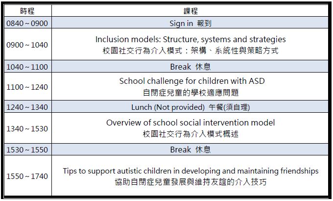 本次課程非常榮幸邀請到JASPER介入模式的創始人-Dr. Connie Kasari來為我們授課。Dr. Kasari是一名享譽國際的人類發展與心理學教授,同時也是加州大學洛杉磯分校自閉症醫療研究中心(Center for Autism Research and Treatment of the University of California at Los Angeles, CART of UCLA)的創始人之一。課程中將會介紹校園社交行為介入模式於自閉症學童的運用,以及如何促進自閉症學童建立與維持友誼的社交互動技巧,並將其融入至校園生活。希望藉由此課程,讓家長、照顧者,以及醫療與教育領域從業人員,能夠更瞭解自閉症孩童在學校適應的困難,並知道如何幫助他們建立良好的校園社交網絡!