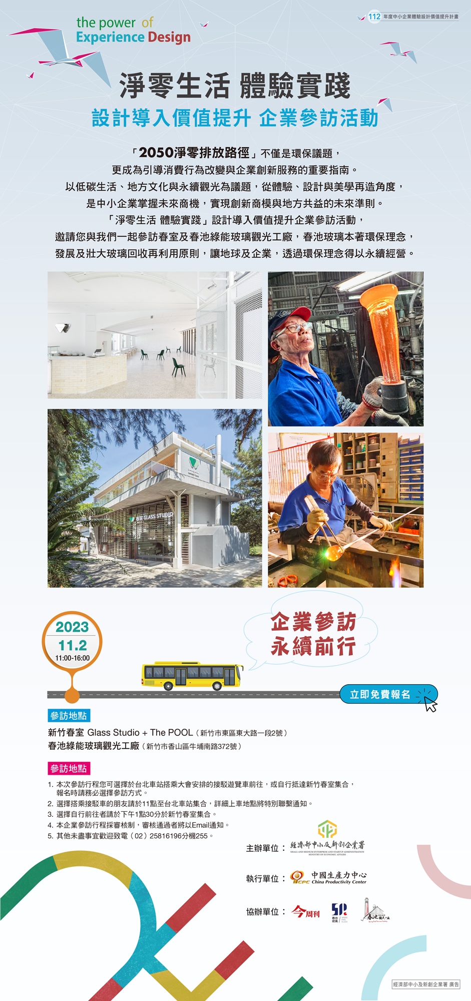 特別說明:本次參訪行程您可選擇於台北車站搭乘大會安排的接駁遊覽車前往,或自行抵達新竹春室集合,報名時請務必選擇參訪方式。選擇搭乘接駁車的朋友請於11點至台北車站集合,詳細上車地點將特別聯繫通知。選擇自行前往者請於下午1點30分於新竹春室集合。本企業參訪行程採審核制,審核通過者將以Email通知。其他未盡事宜歡迎致電(02)25816196分機255。
