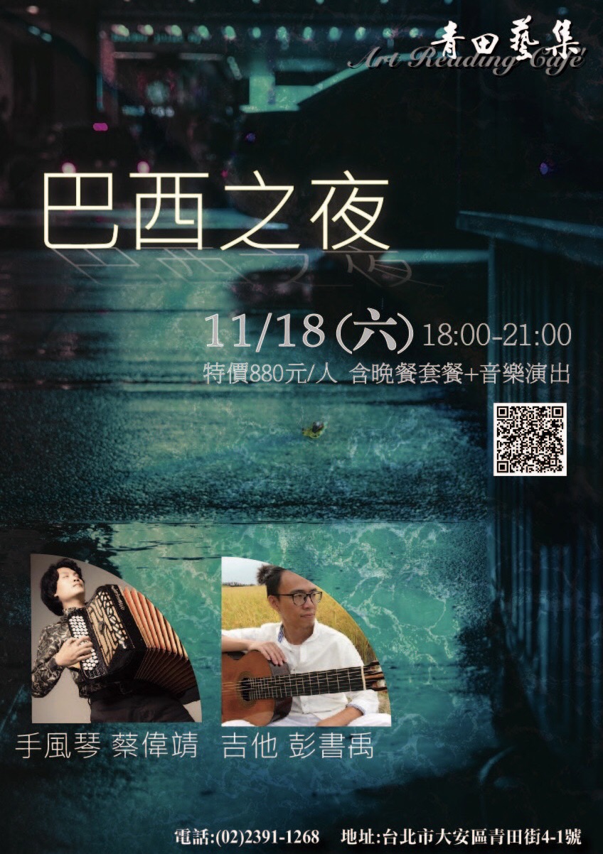 這場音樂會將由手風琴演奏家:蔡偉靖 和吉他手: 彭書禹 , 演出多首經典的Choro, Bossa Nova,與 Jazz以及電影配樂,帶給大家不一樣手風琴之夜。