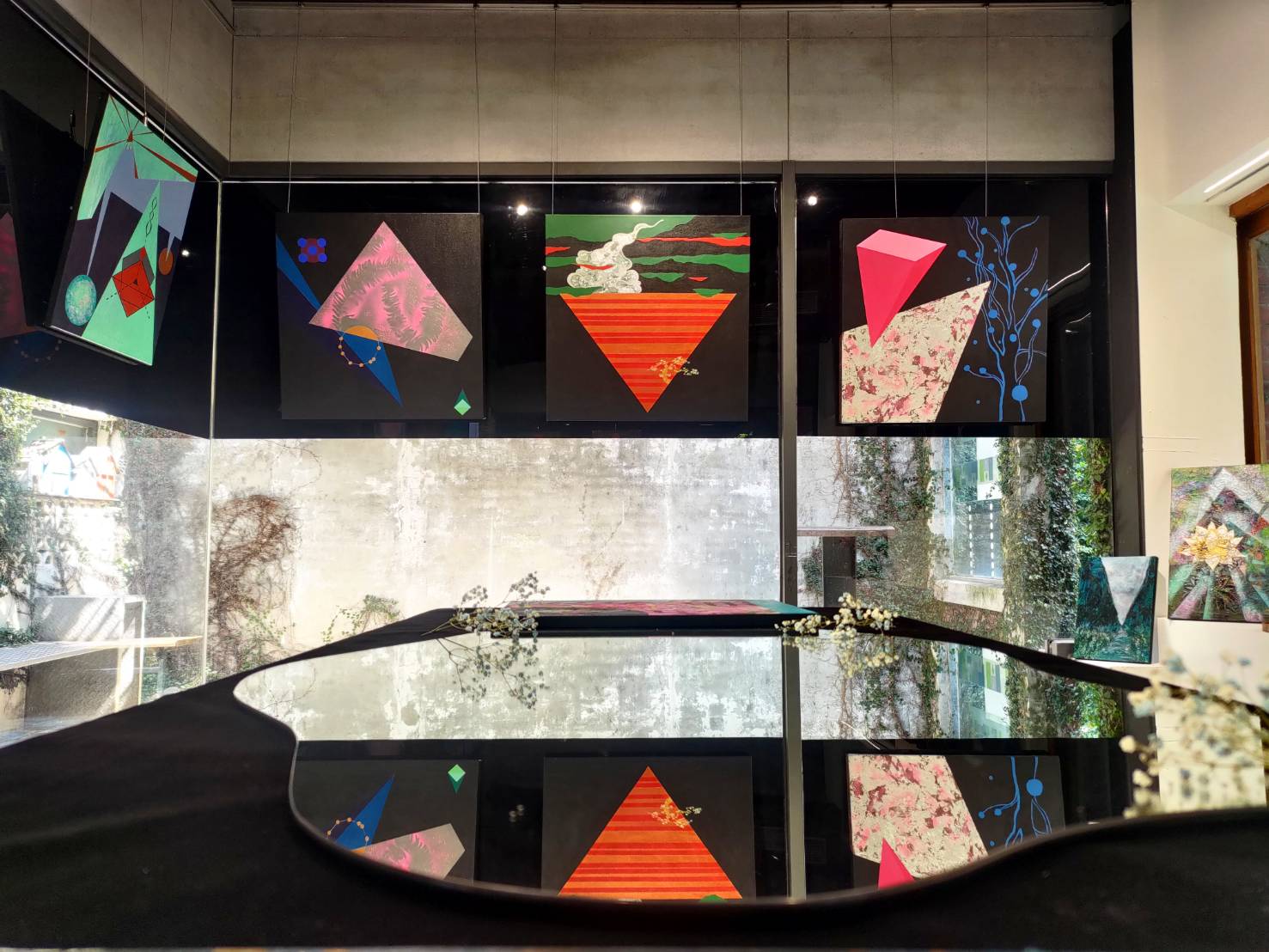 整個展間使用半遮蔽的方式 營造神秘感,中間放置的鏡子為銀河意象,透過鏡子你可以看到不同角度的作品,感受不同的氛圍,j歡迎大家來到展間,訴說自己的見解和聽到的回聲