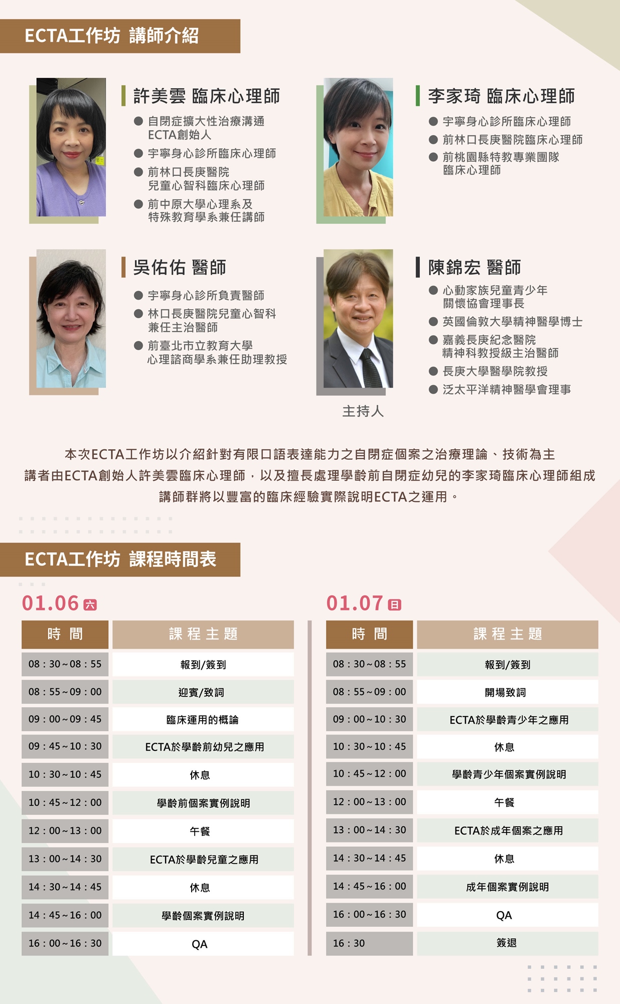 本次ECTA工作坊以介紹針對有限口語表達能力之自閉症個案之治療理論、技術為主,講者由ECTA創始人許美雲臨床心理師,以及擅長處理學齡前自閉症幼兒的李家琦臨床心理師組成, 講師群將以豐富的臨床經驗實際說明ECTA之運用。