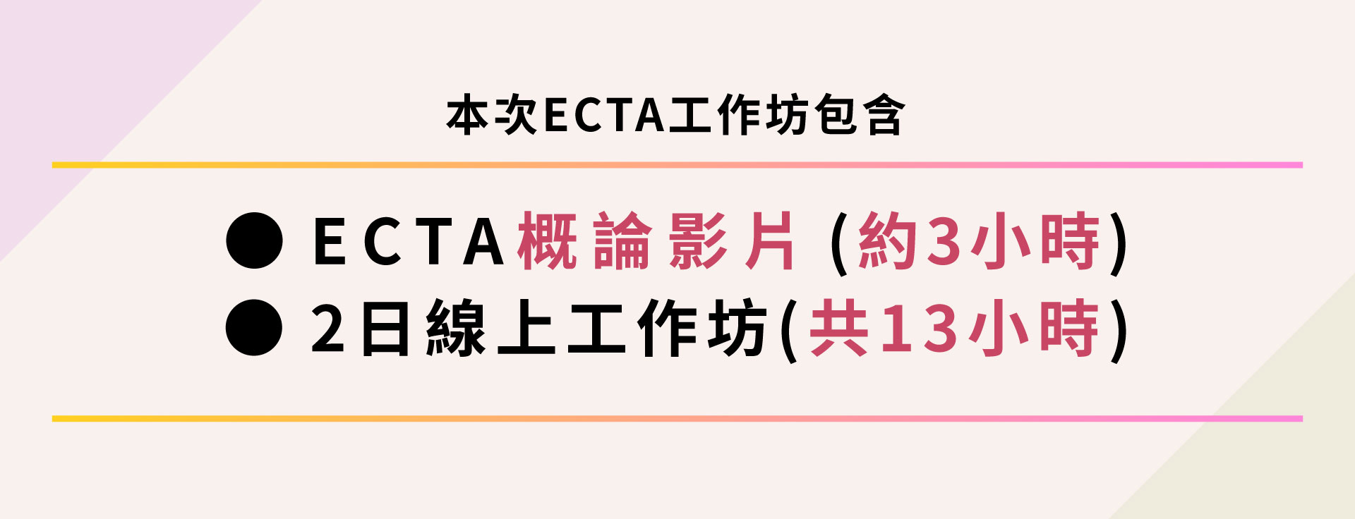 ▶ 課程說明 : 此課程將包含一部ECTA概論基礎課程影片(供課前觀看)+2日線上工作坊(共13小時)