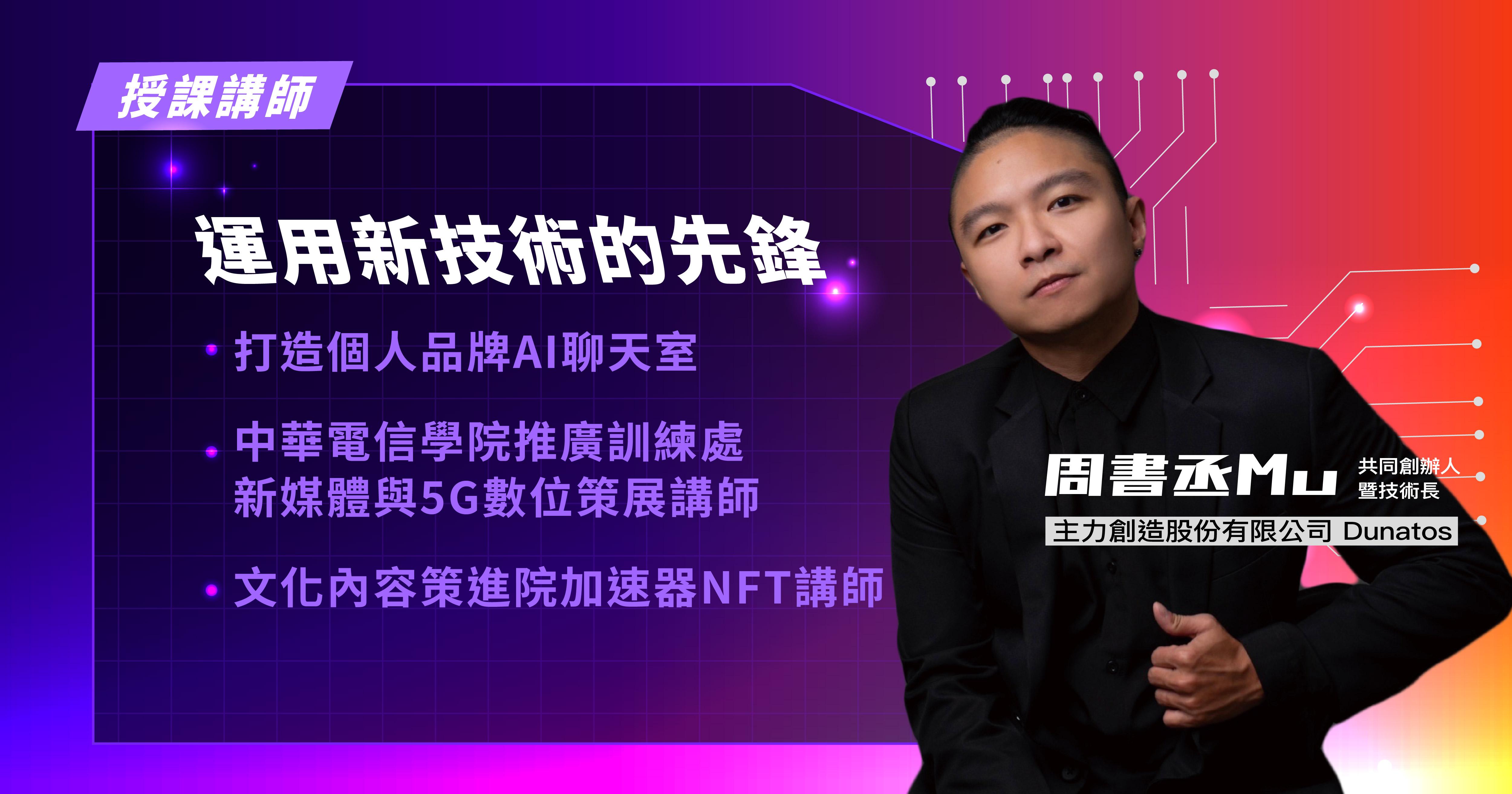 周書丞講師為主力創造股份有限公司之共同創辦人暨技術長,同時擔任中華電信學院推廣訓練處新媒體與5G數位策展講師,以及文化內容策進院加速器NFT講師。專業領域為:直播串流、線上策展、NFT、Metaverse、即時通訊、跨國電商。