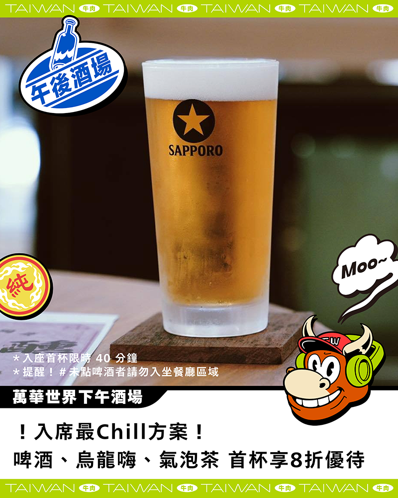 活動場地與「萬華世界下午酒場」協力合作,凡購買嗑牛趴餐食至餐廳區域用餐,合作飲品享八折優待,首杯入座限時四十分鐘,未購酒者請勿入座餐廳區域。