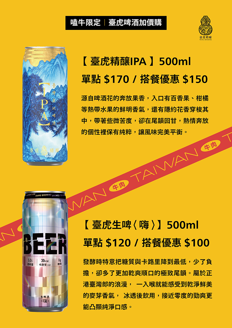 臺灣牛肉怎麼處理才夠完美?由飲食顧問 徐仲,攜手「臺虎精釀」、「欣葉小聚」、「野牛殿」隔空對決,推出三道限量臺灣牛肉料理,分別採用滷燉、油煎、火烤等多種精湛技巧,細緻烹調呵護,讓肉質的鮮美多汁一躍舌尖。