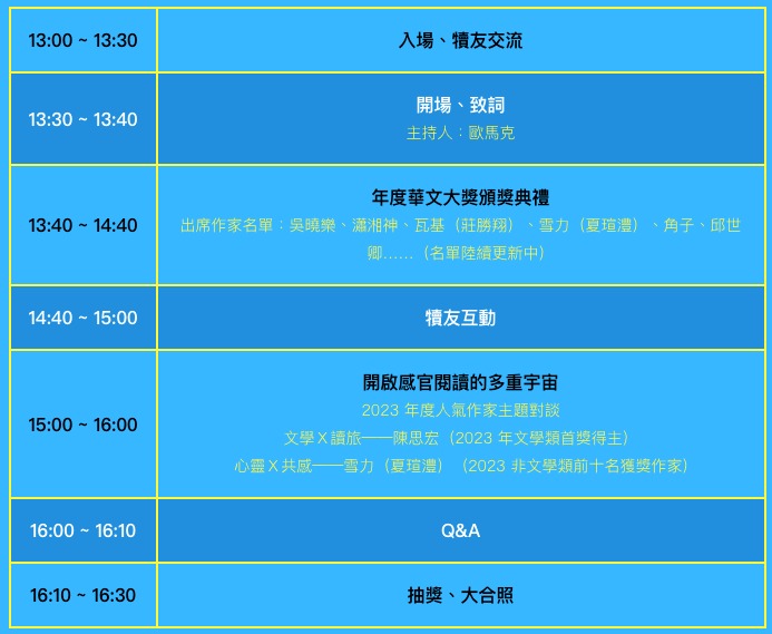 ・本次活動因考量人數眾多與場地限制,恕不安排作家簽名與個人合影,亦婉謝花禮。