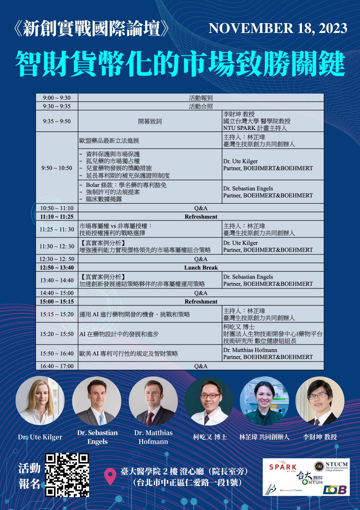 本次論壇將由歐洲最大專利事務所 Boehmert & Boehmert 的國際專家們,來台分享專利戰略的親身實戰經驗。承襲先前國際智財策略與實務論壇熱烈好評,再次邀請在製藥及生物技術產業有豐富經驗的 Boehmert & Boehmert 合夥人 Dr. Ute Kilger,她曾主導的專利協助擁有專利權的公司以 4.7 億美金被國際大廠收購,為新創團隊的併購產生極高價值。針對新世代的技術應用,本次論壇更結合兩位具豐富 IT 及 AI 產業經驗的國際專利律師:專長是處理IT產業不公平競爭與智財糾紛的專家 Dr. Sebastian Engels 與在機器學習及醫學分析的 AI 專利專家 Dr. Matthias Hofmann。在跨領域的創業時代,需要跨領域的專利策略佈局幫助您前進國際市場獲利。