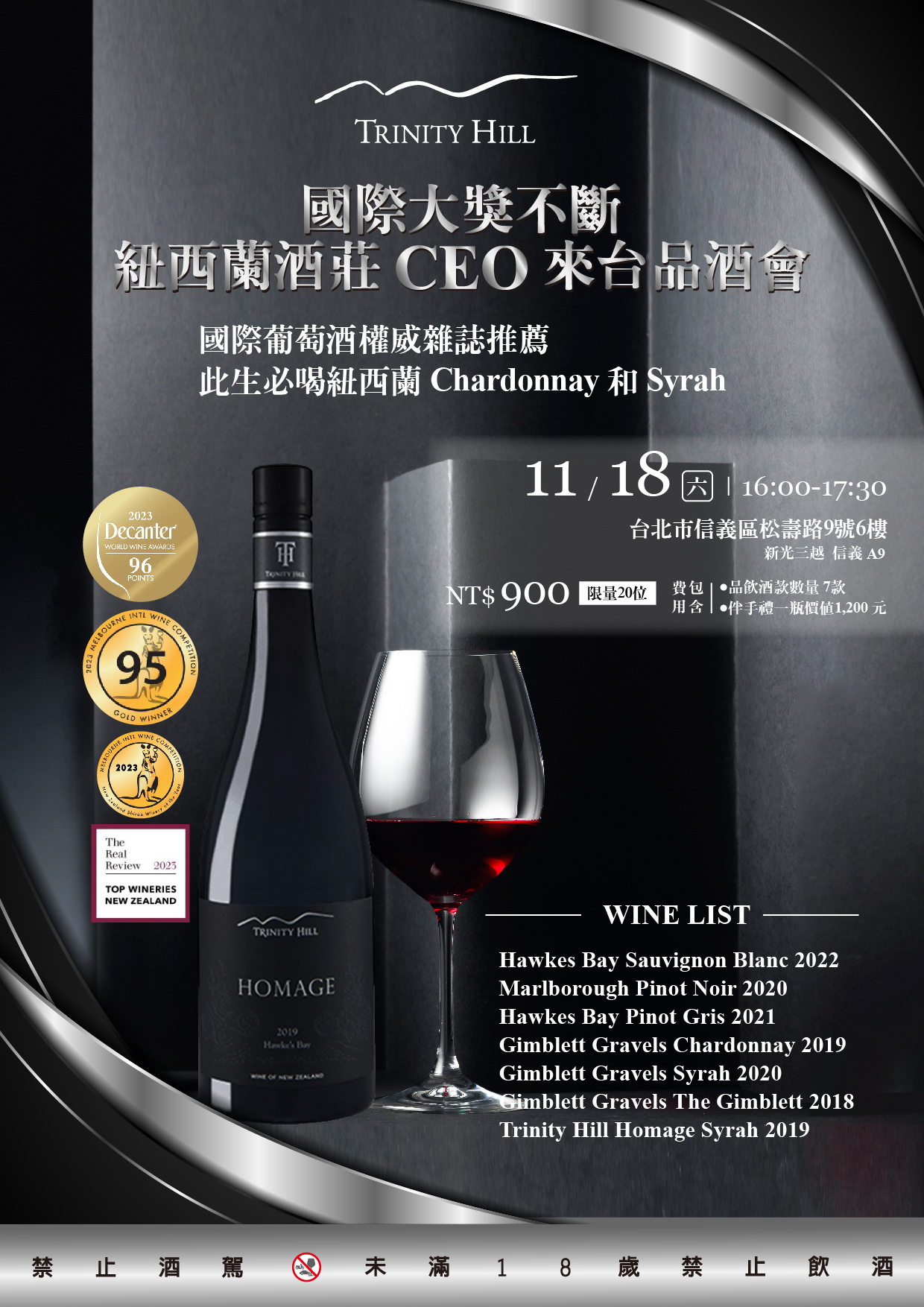 📣參加者可領取伴手禮一瓶Trinity Hill Hawkes Bay Pinot Noir 2021(價值NT.1,200元)。