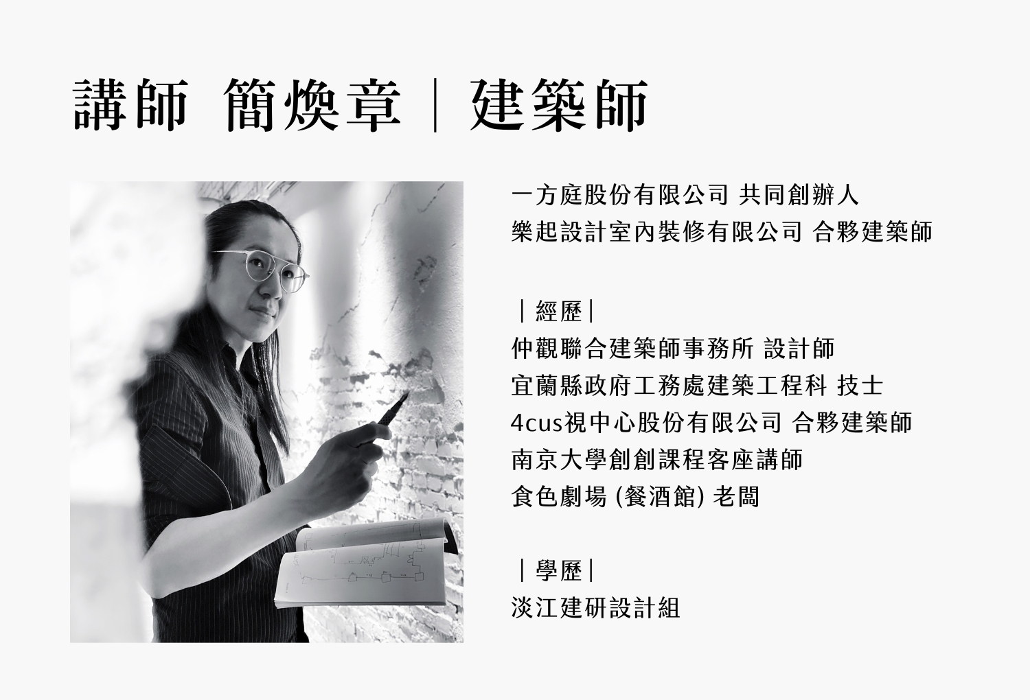 簡煥章建築師,1979 年生,淡江建築碩士畢。‘04 年開始參與過台灣不少重要項目如信義誠品旗艦店展演空間、桃園機場捷運站體規劃、旺旺中國時報辦公室 ( IF 金獎)、基隆海科館 ( AIANY 首獎 )、華碩創辦人三藩市頂級莊園、教父牛排等無數得獎案件。