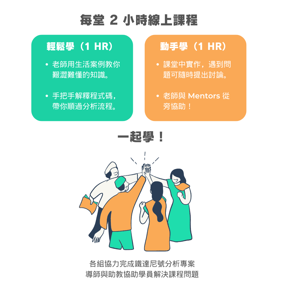 與團隊合作進行「鐵達尼號生存率預測」的數據分析案例,實際應用分析知識和 Python 技巧,透過實作,掌握所學。在專案結束時,將在結業式邀請各組分享分析的心得和經驗,透過交流獲得珍貴的反饋和建議!