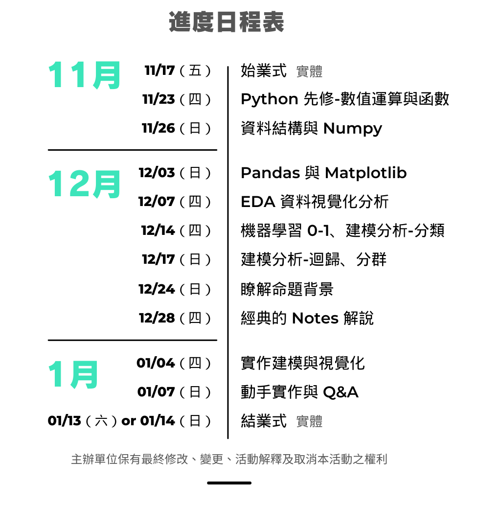 - 始業式時間為 11/17(五)19:00-21:00、結業式時間為 2024 年 1/13 或 1/14(時間未定),地點為:台北市信義區基隆路一段 178 號 4 樓(AppWorks Lounge),請務必到場參與。