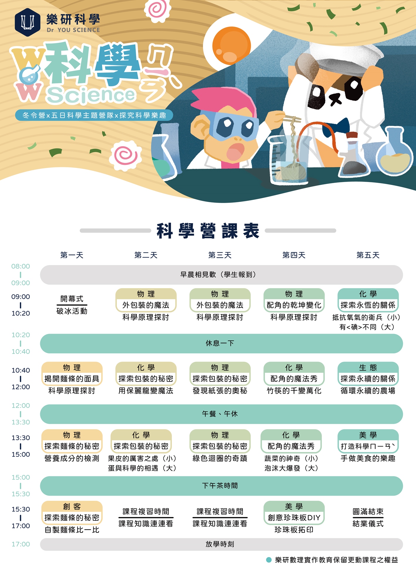 本課程將透過科學實作來探索麵中的樂趣,從麵的成分、麵條到外包裝的組成,進行一一的探索,並從中學習相關科學知識與樂趣,課程中結合科學實作及美學,希望透過課程的安排,培養學員的創造力、觀察力和科學思維。同時也讓他們明白到科學無處不在,即使在一碗平凡的泡麵中,也蘊藏著無窮的秘密和樂趣,一起來探索無窮的「科學ㄇ一ㄢˋ」世界吧!