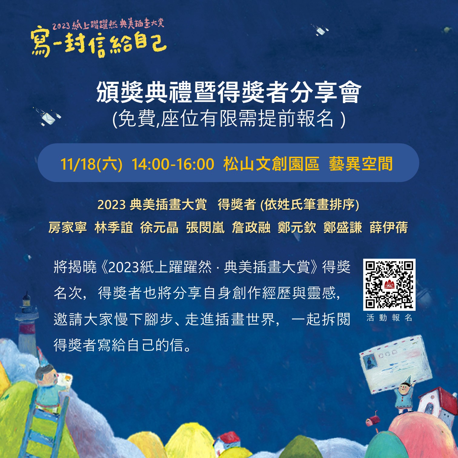 活動中將揭曉《2023紙上躍躍然 ‧ 典美插畫大賞》得獎名次,並邀請得獎者分享自身創作經歷與靈感,讓我們慢下腳步、走進插畫世界,一起拆閱創作者寫給自己的信。