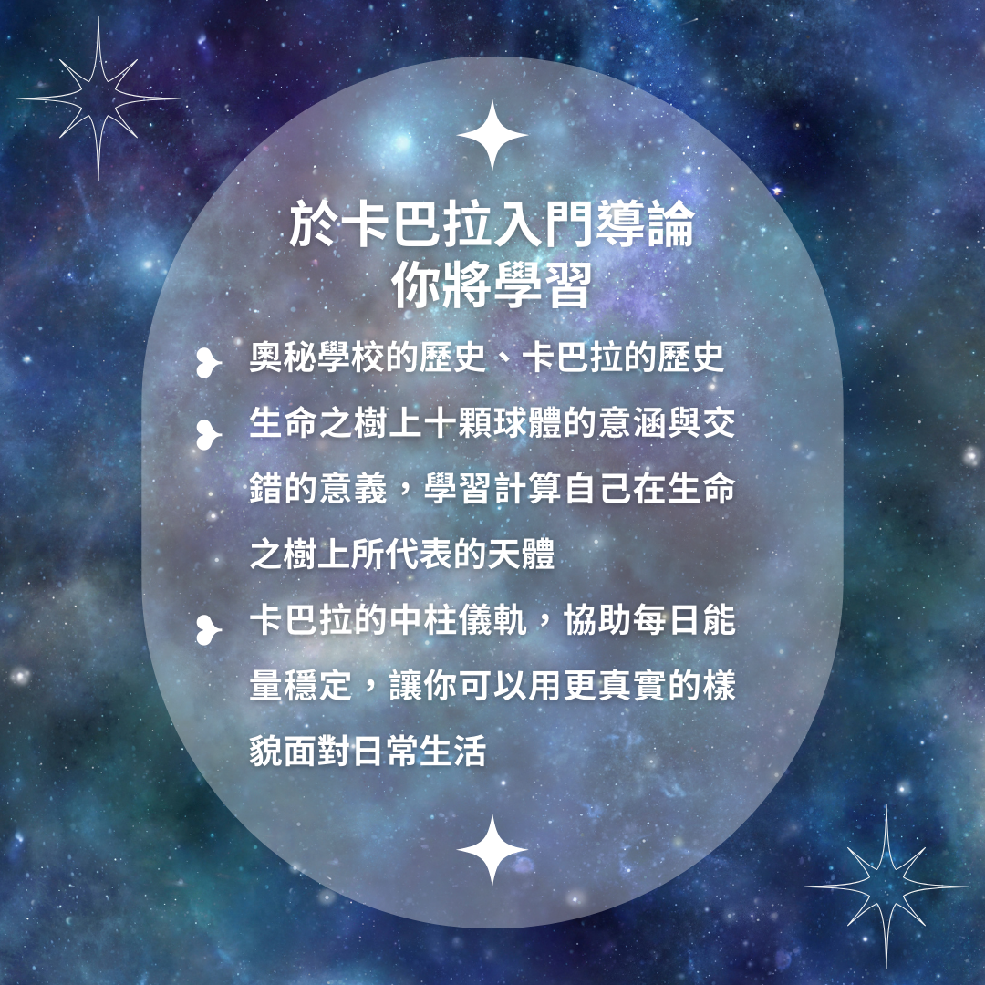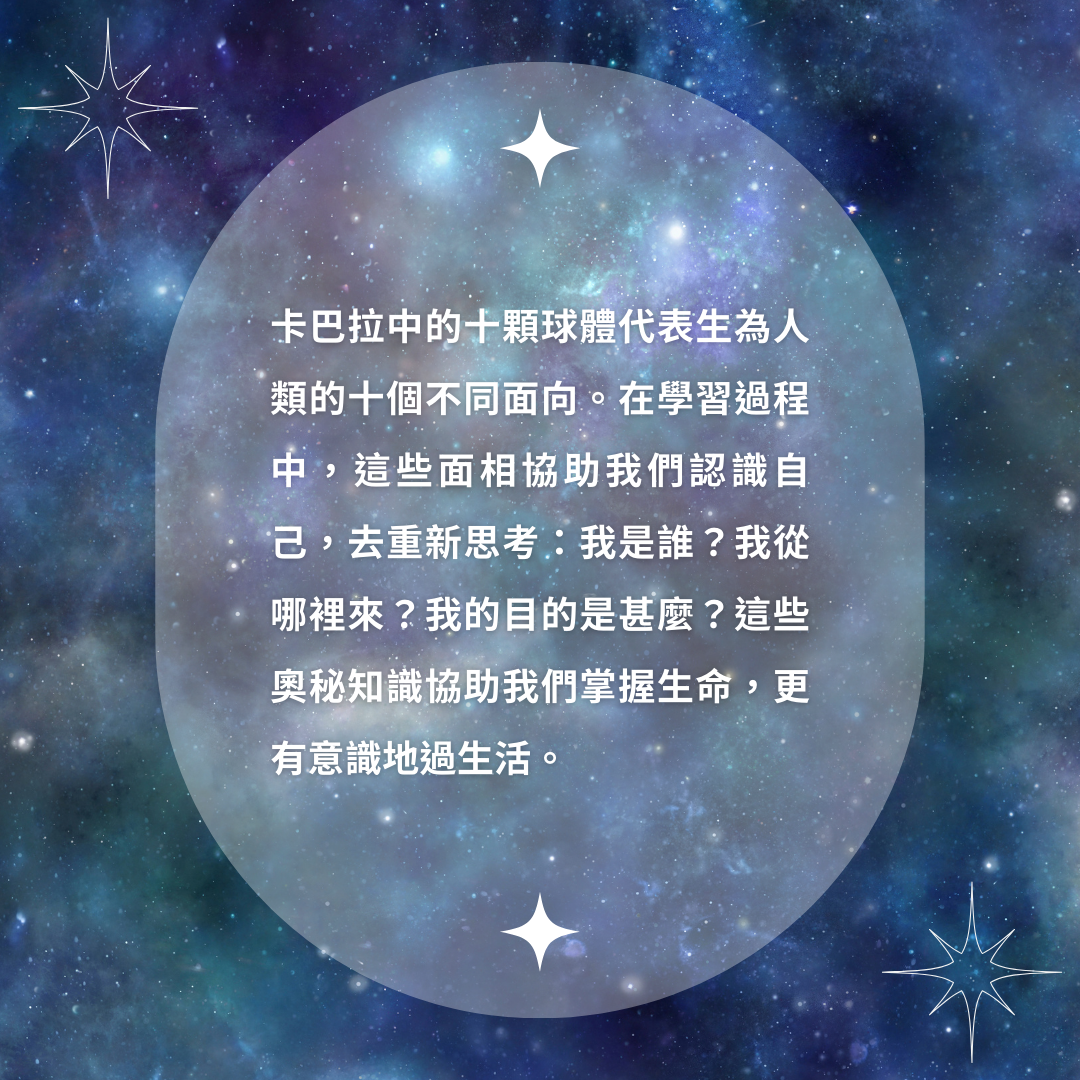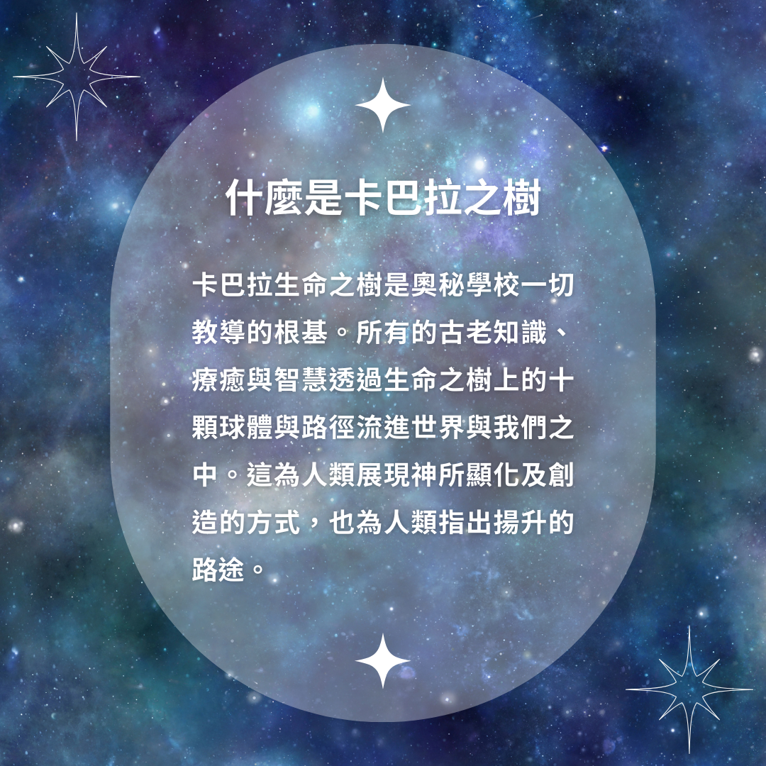 在此工作坊中,我們介紹奧秘學校的歷史、卡巴拉的歷史、生命之樹上十顆球體的意涵與交錯的意義。你將學習計算自己在生命之樹上所代表的天體,這關聯著你的特質與才華,可讓你更理解自己帶來的力量與天賦。