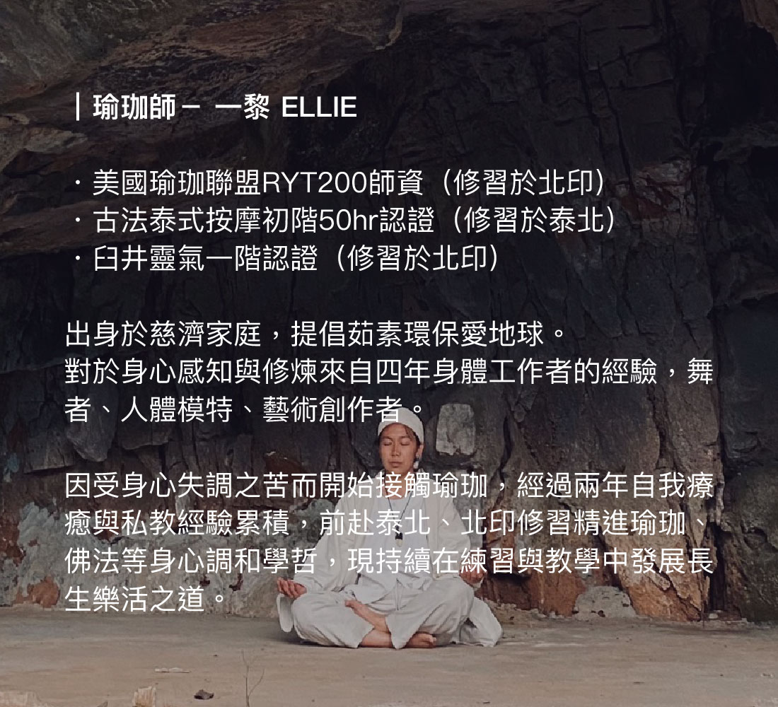 因受身心失調之苦而開始接觸瑜珈,經過兩年自我療癒與私教經驗累積,前赴泰北、北印修習精進瑜珈、佛法等身心調和學哲,現持續在練習與教學中發展長生樂活之道。