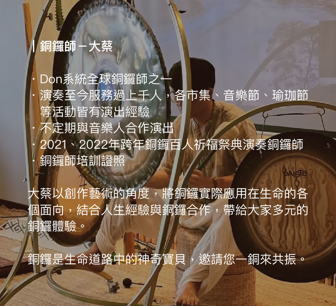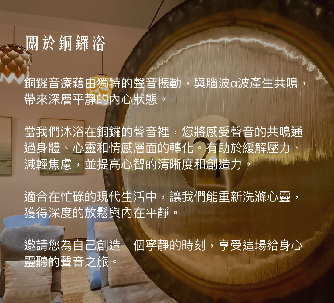 本次課程前半部將透過關鍵體式輔以發聲練習,加強感知呼吸調節的作用肌肉、三大腔室與閘門;後半段在銅鑼浴的聲震與癒療中,讓自體修復、心神調和、收束靜藏。