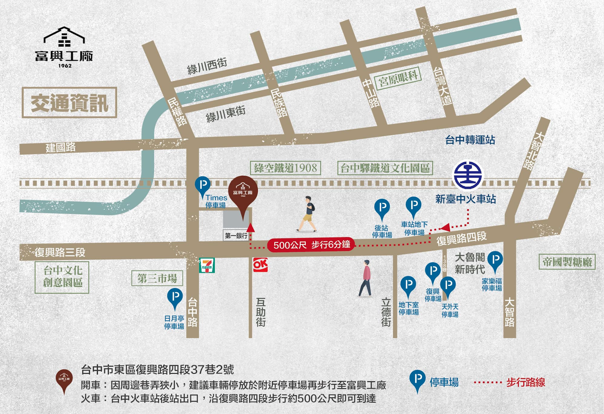 - 交通資訊:(場域週邊巷弄較為狹小,且均為私人付費停車場無停車合作折抵,建議可搭乘大眾運輸到台中火車站後步行前往)