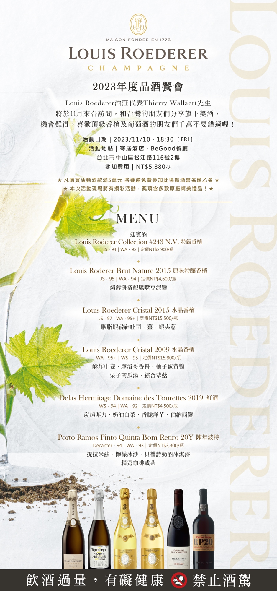 本次品酒會夏朵菸酒非常榮幸地邀請到睽違多年的Louis Roederer香檳廠出口總監Thierry Wallaert先生,親自帶領您一同品酩。精選旗下4款香檳、1款紅酒、1款波特酒,總價值超過$46,600的酒款,與主廚客製化精心準備的餐點完美搭配。現場另有精彩抽獎活動,皇室般的奢華品味,不容錯過!