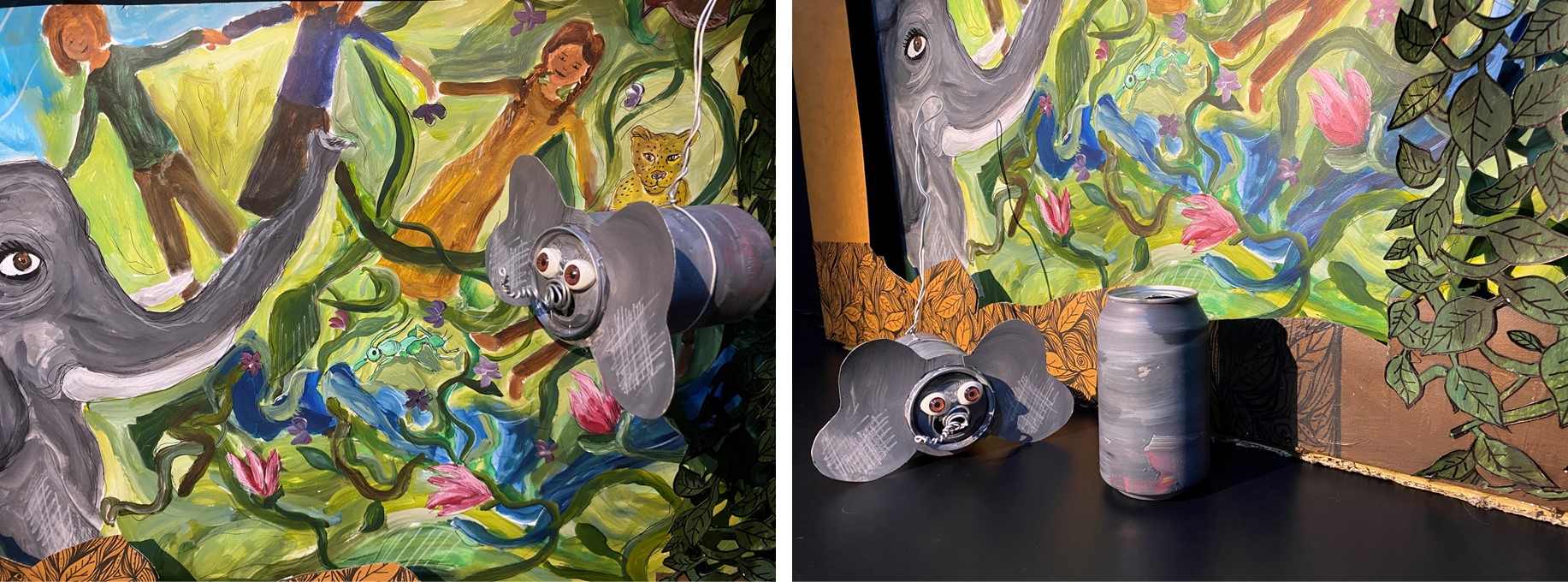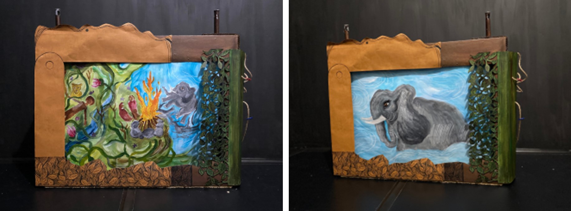 小小創作者跟著大象奶奶來到「移動式全景圖」前分享介紹完成的懸絲戲偶。