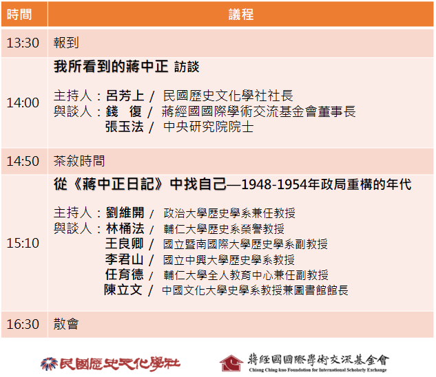 學社與蔣經國國際學術交流基金會在《蔣中正日記》出版的一周多後,舉辦這場「尋找自己的蔣中正」座談會,由主辦單位及邀請的學者一起來分享讀過1948-1954年《蔣中正日記》後,或與自身經歷過的相同歲月、或是自身曾研究過的史實,甚而是曾經接觸過蔣先生的經驗,一同來解讀日記中蔣先生的自省與心境、也交流各自找尋到認為蔣先生的真實面。