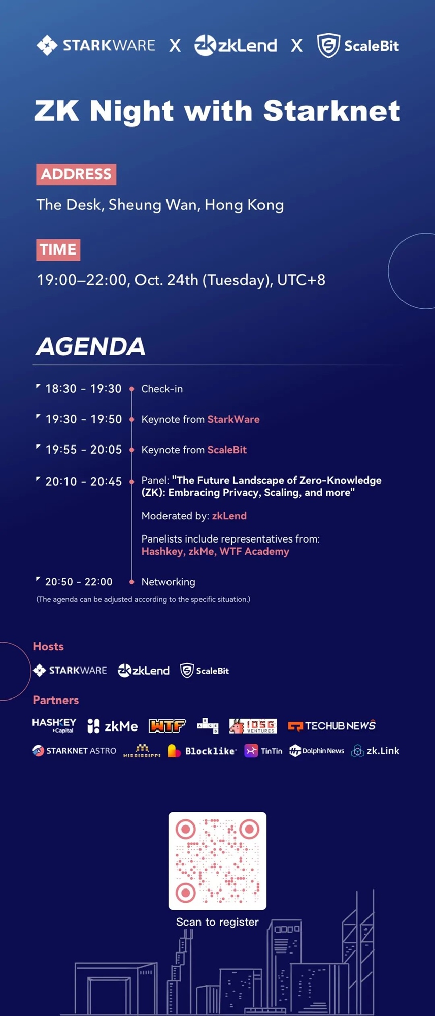 10 月 24 日,旨在為 Web3 Mass Adoption 提供全方位安全解決方案的區塊鏈團隊 ScaleBit 將攜手 StarkWare & zkLend,在香港·中環舉辦 ZK Night With Starknet 線下活動,我們邀請到了 HashKey Capital、zkMe、WTF Academy 等眾多 Web3 領域知名項目,共同搭建一個知識共享、思維碰撞的舞台,全面瞭解 ZK 技術的發展與潛力。