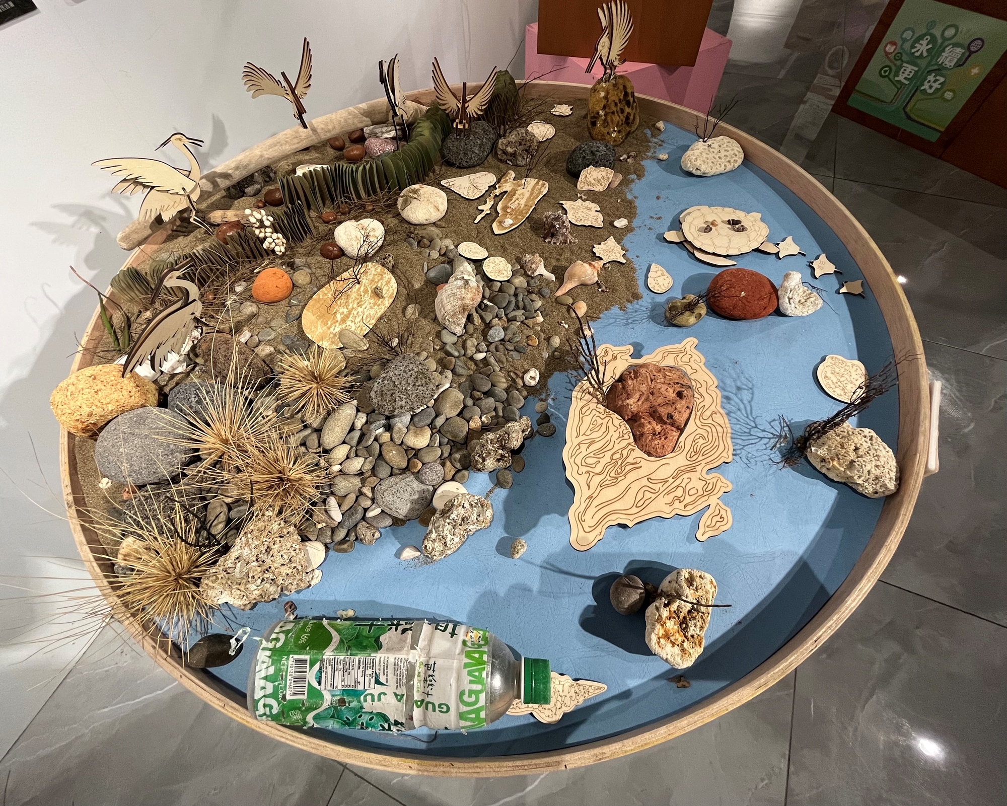 接近是認識的開始,新市鎮開發改變了北台灣的臨海地景。透過陳江河建築師的帶領,順著海岸線,踏查數條河川入海的生活與地景種種的博物學採集與認識,指認環境巨大變遷的力量下殘存的生態軌跡,在人跡所少至之處,仍舊可以生氣盎然。透過圖像採集轉成雷射切割的線圖而製作具體的生態描述。為了展覽再現於「沙盒」之中。佈置沙盒是一種地方知識的拼貼,有是一種期待,關於這片土地的復育與可能。
