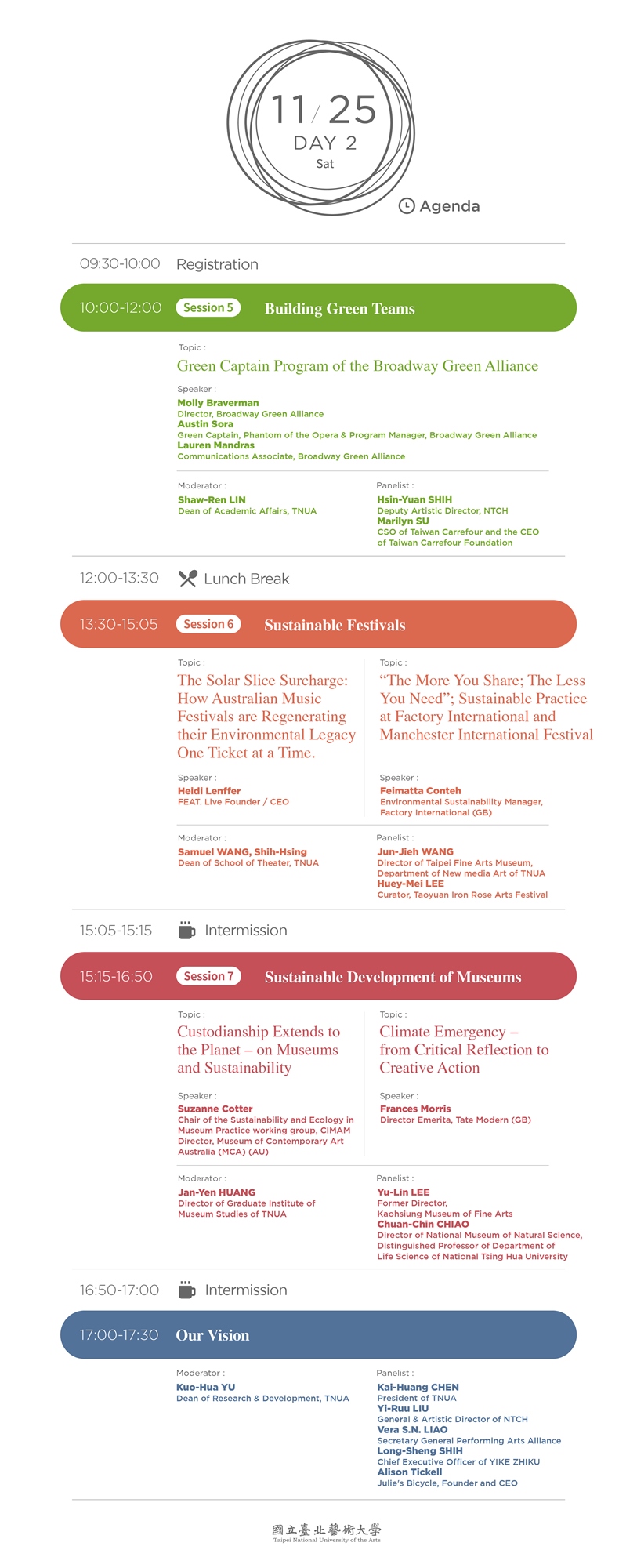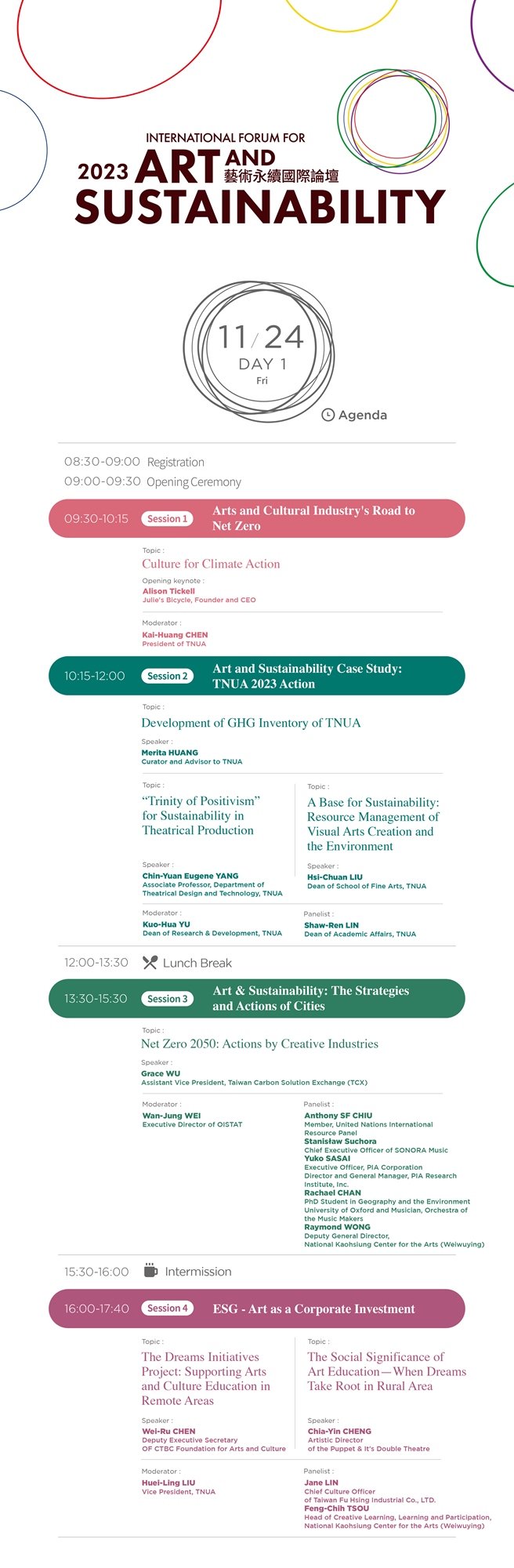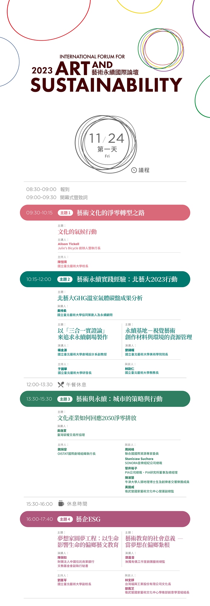 The 2023 International Forum for Art and Sustainability will be held on November 24th and 25th, and will be broadcast live online in both Chinese and English channels on the YouTube platform. Through 7 sessions and Our Vision of the forum, we hope to engage in in-depth international dialogues and explore how sustainability actions within the arts can align with global trends and incorporate localized practices in Taiwan.