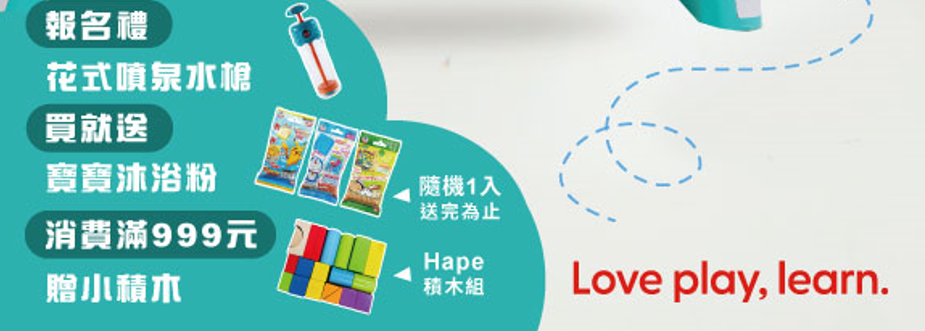 【滿額禮】當天店內買德國Hape限時85折,買就送寶寶沐浴粉、滿999再送繽紛小積木(20入)