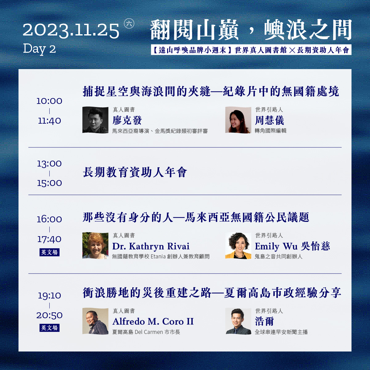 - 「衝浪勝地的災後重建之路—夏爾高島市政經驗分享」與「那些沒有身分的人 — 馬來西亞無國籍公民議題」兩場次主要為英文進行, 現場備有同步口譯設備。