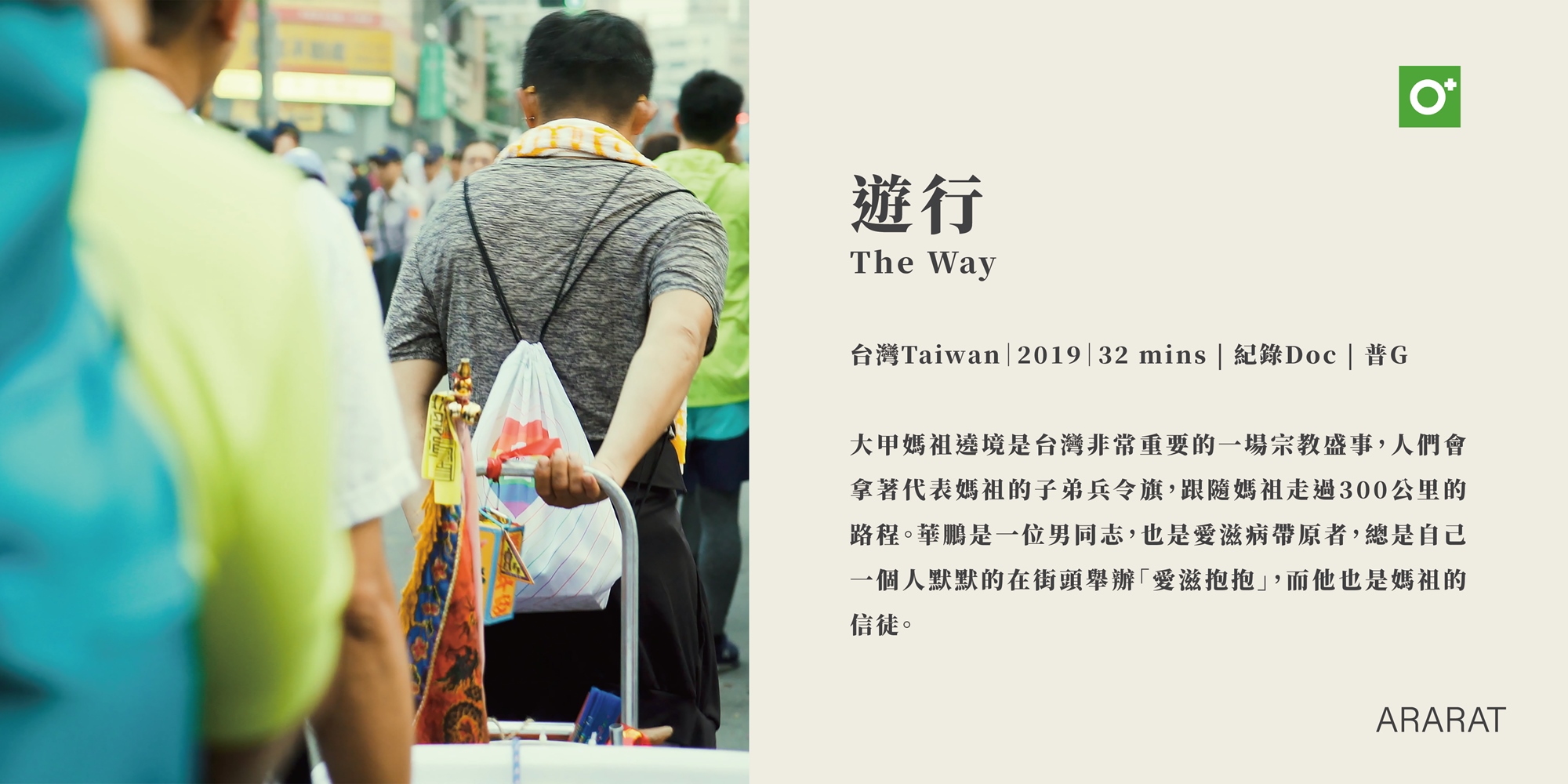 大甲媽祖遶境是台灣非常重要的一場宗教盛事,人們會拿著代表媽祖的子弟兵令旗,跟隨媽祖走過300公里的路程。華鵬是一位男同志,也是愛滋病帶原者,總是自己一個人默默的在街頭舉辦「愛滋抱抱」,而他也是媽祖的信徒。