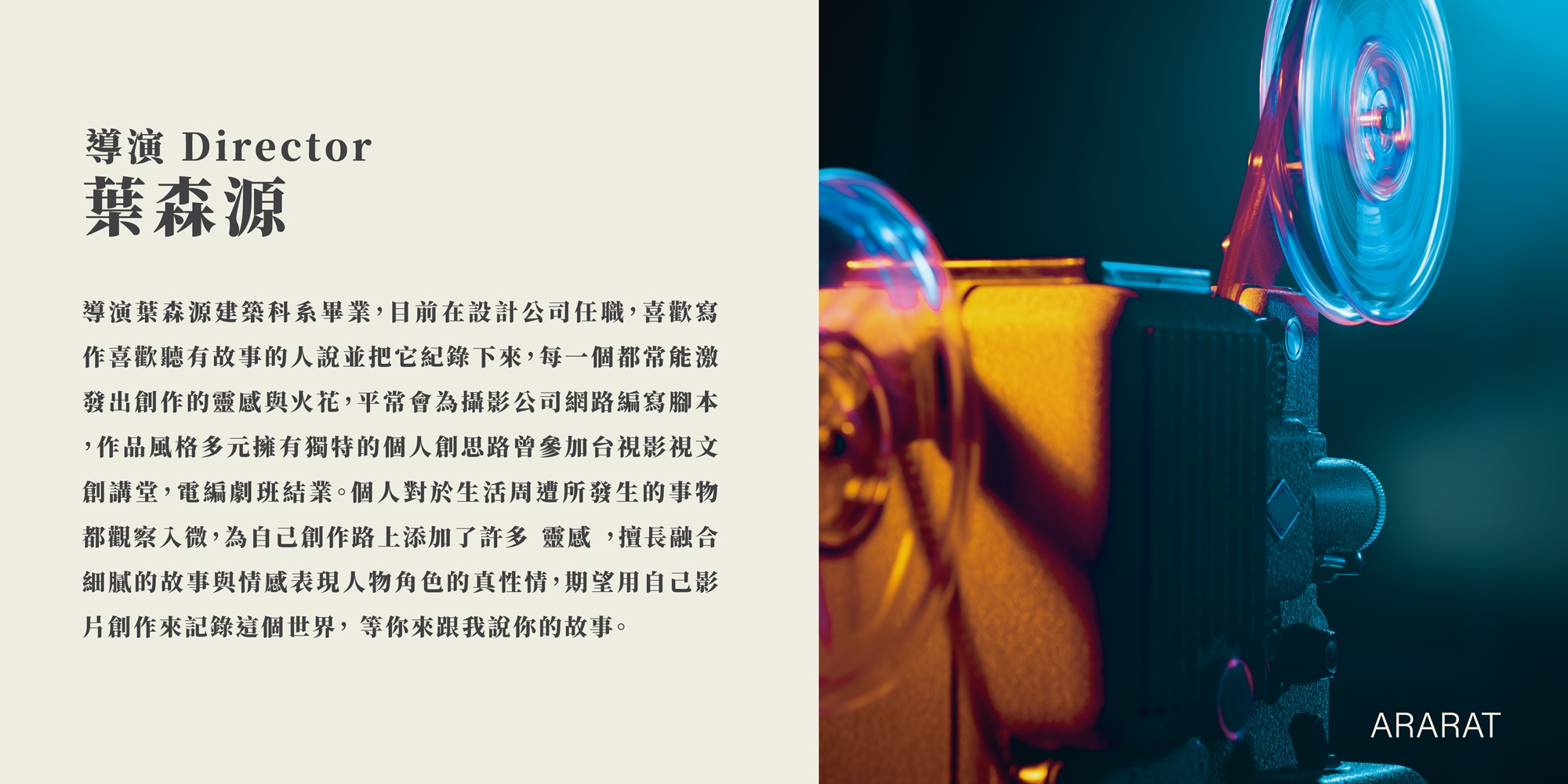 導演葉森源建築科系畢業,目前在設計公司任職,喜歡寫作喜歡聽有故事的人說並把它紀錄下來,每一個都常能激發出創作的靈感與火花,平常會為攝影公司網路編寫腳本,作品風格多元擁有獨特的個人創思路曾參加台視影視文創講堂,電編劇班結業。個人對於生活周遭所發生的事物都觀察入微,為自己創作路上添加了許多 靈感 ,擅長融合細膩的故事與情感表現人物角色的真性情,期望用自己影片創作來記錄這個世界, 等你來跟我說你的故事。