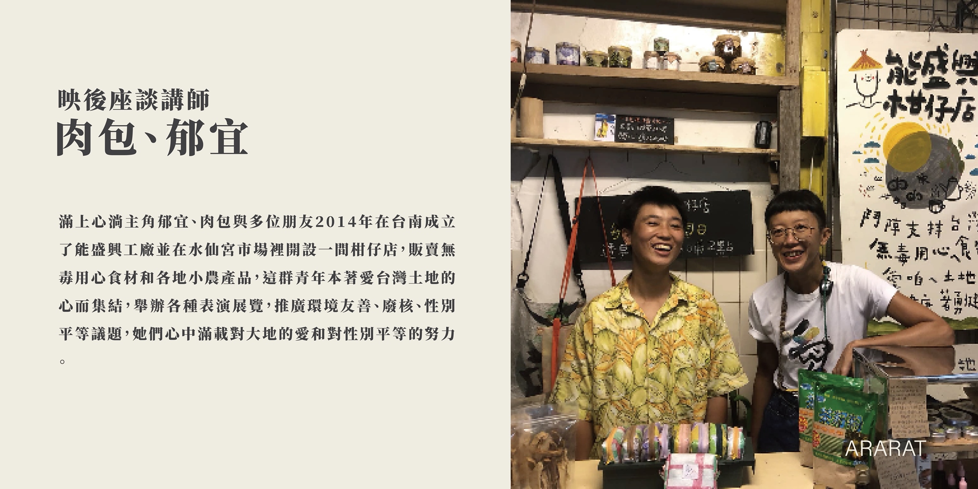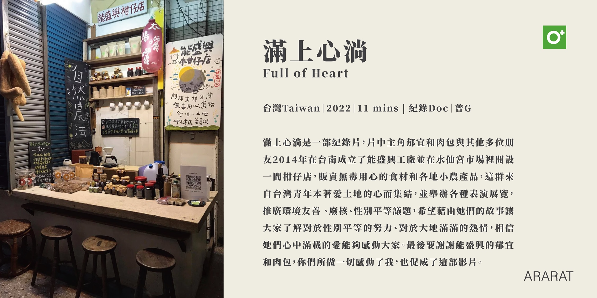 滿上心淌主角郁宜、肉包與多位朋友2014年在台南成立了能盛興工廠並在水仙宮市場裡開設一間柑仔店,販賣無毒用心食材和各地小農產品,這群青年本著愛台灣土地的心而集結,舉辦各種表演展覽,推廣環境友善、廢核、性別平等議題,她們心中滿載對大地的愛和對性別平等的努力。